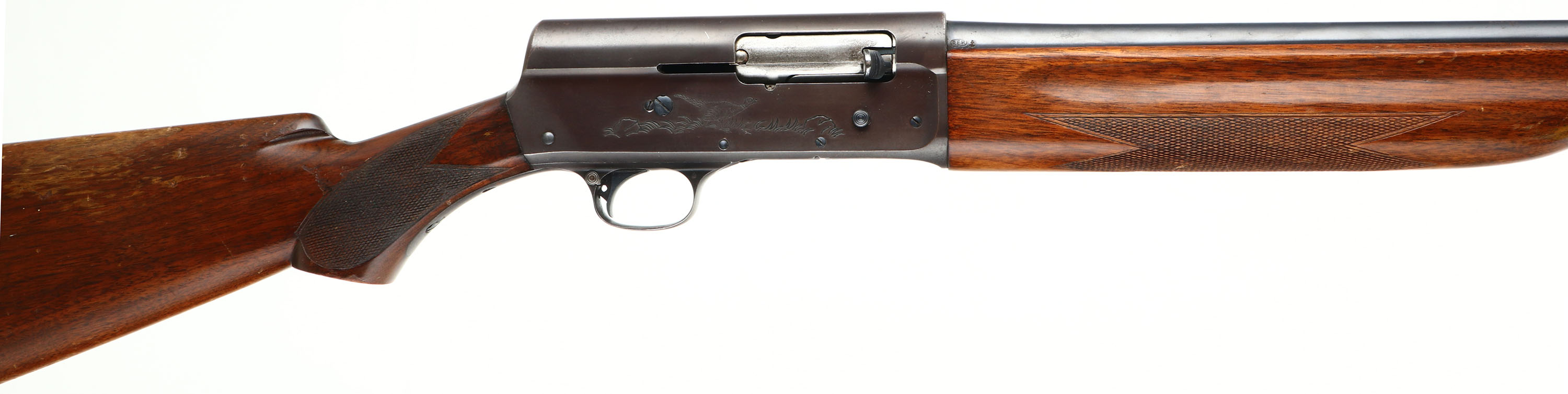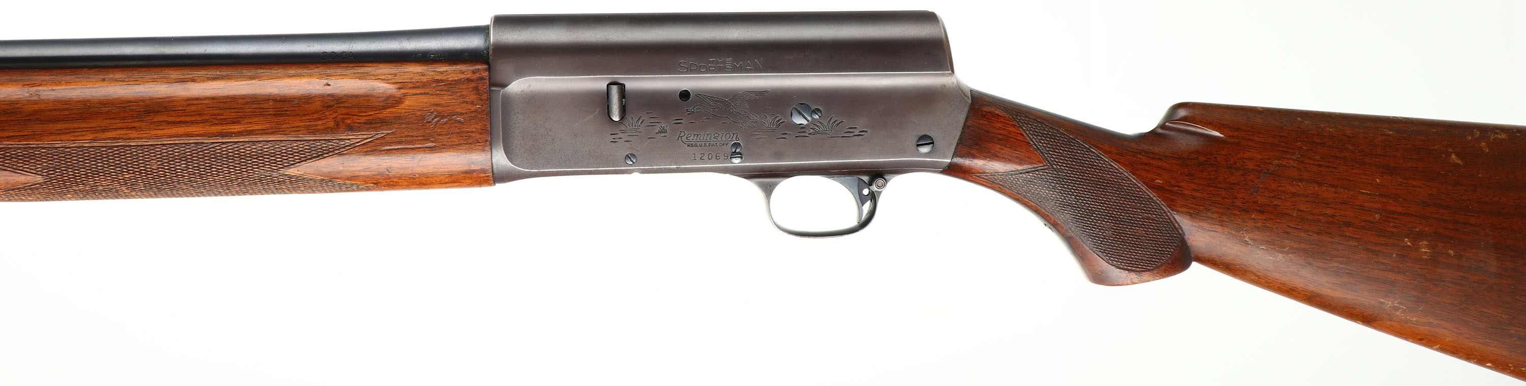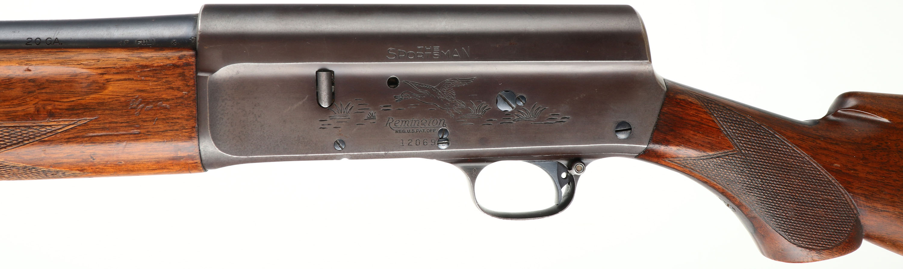 Remington Model ''The Sportsman'', CAL: 20 GA, MFG: 1959, SN: 12069, Semi-Auto Shotgun, Choke: Full, 28'' barrel. The left side of the receiver displays a roll stamp engraving of a flying mallard in a pond setting & the right side displays a pheasant in a grassy area. The checkered, flat pistol grip wood stocks are excellent, with some scratches, minor contusions & thinning or wear to the original. The metal blue finish rates 90% overall, with the finish on the receiver toning plum. Bore is excellent. Barrel fitted with a front bead on top of a small ramp. Buttstock carries a Remington, black plastic buttplate. LOP: 13 7/8''. FFL or C&R Req - Value: 300 to 600