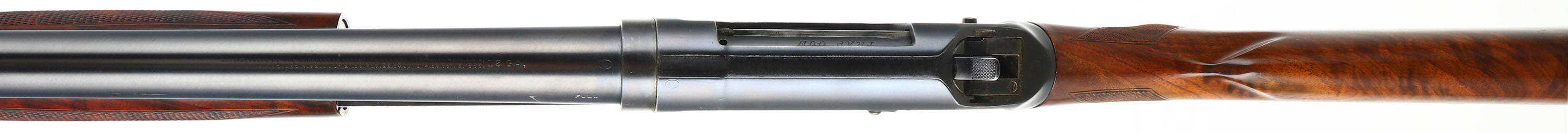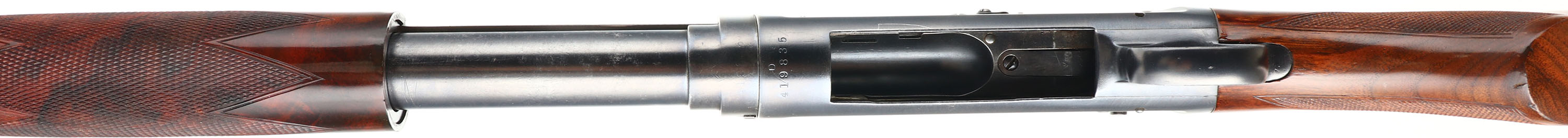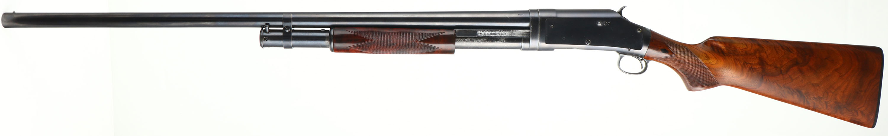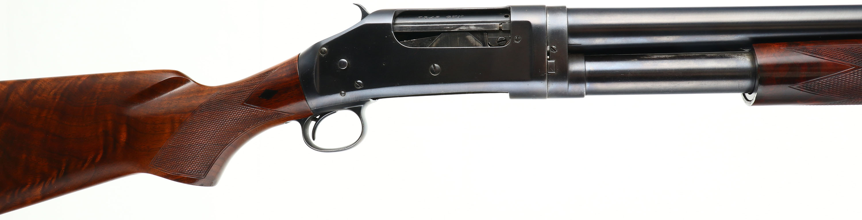 RARE Winchester, Model 97 BLACK DIAMOND TRAP GRADE, 12 Ga., MFG. 1908, SN: 419835, Take-down Pump Action Shotgun, Choke: Full, 30'' No rib carrel. This fantastic shotgun has been fully & professionally restored to an excellent overall condition. The original, fancy, high grade, hand checkered & flat pistol grip wood stocks are excellent. They display wonderful flame, rippled & feathered grain. There are very few tiny handling marks to the excellently executed finish. The wrists display the black diamonds & the checkering at the wrist & on the forend are sharp. The restored metal blue finish rates 98% on barrel & receiver, 90% on the mag tube. Matted receiver. ''TRAP GRADE'' marked bolt. Bore is excellent. Single front bead. Stock carries a Winchester marked plastic buttplate. An excellent high grade shotgun. FFL or C&R Req. - Value: 1500 to 2500