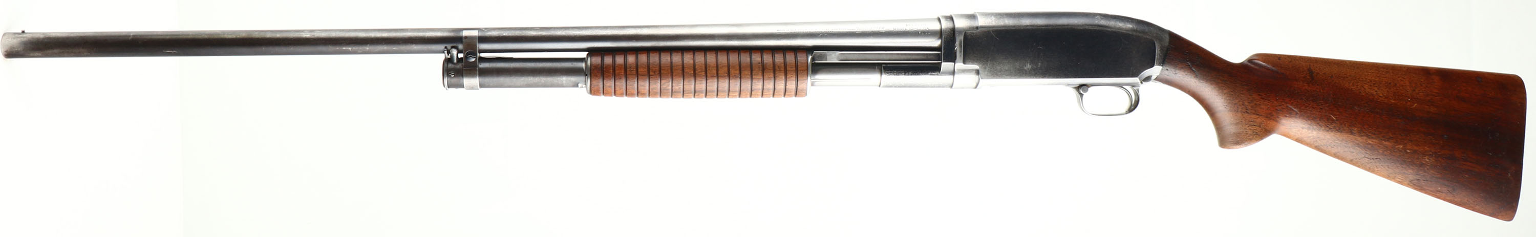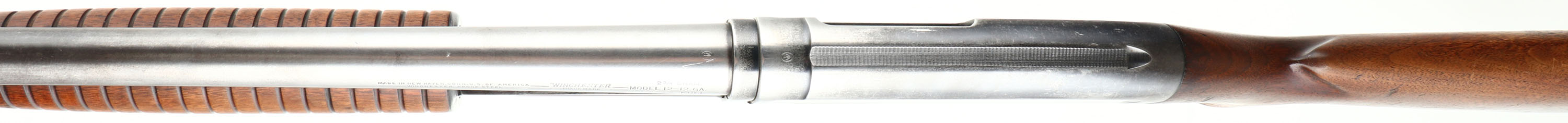 Winchester, Model 12, CAL: 12 GA, MFG: 1940, SN: 855489, Pump Action Shotgun, Choke: Full, 2 3/4'', 30'' Barrel. The original flat pistol grip wood stock & long corncob forend are very good, displaying minor scratches, scrapes, contusions & thinning to the original finish. The original metal blue finish rates 50% overall. Bore is excellent. Single front bead. Matted top of receiver. Buttstock carries no buttplate. LOP 13 3/4'' over pad. FFL or C&R Req. - Value: 300 to 600