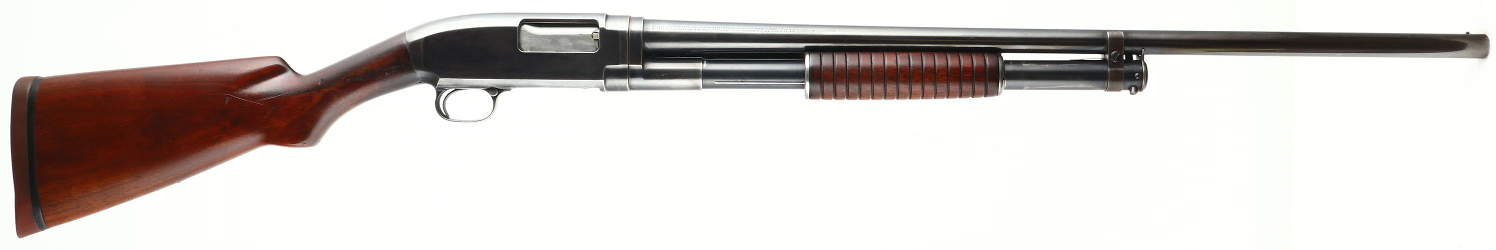 Winchester, Model 12, CAL: 16 GA, MFG: 1917, SN: 173135, Pump Action Shotgun, Choke: Full, 2 3/4'', 26'' Barrel. This shotgun was professionally restored years ago & has sustained typical usage wear since. The original flat pistol grip wood stock & corncob forend are very good, displaying minor scratches, scrapes & contusions to restored finish. The restored metal blue finish rates 90% overall. Bore is very good & bright. Single front bead. Matted top of receiver. Buttstock carries the correct period Winchester solid red recoil pad. LOP 13 1/4''. FFL or C&R Req. - Value: 300 to 600