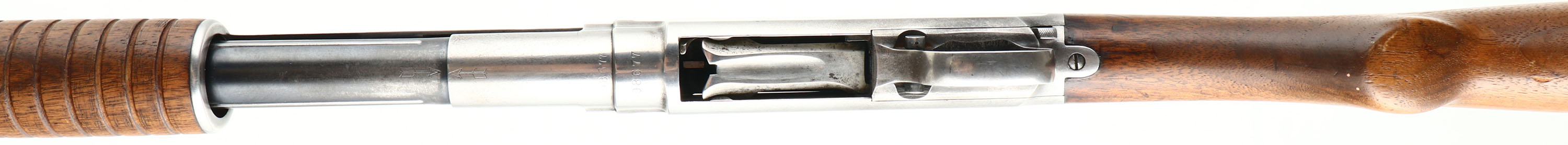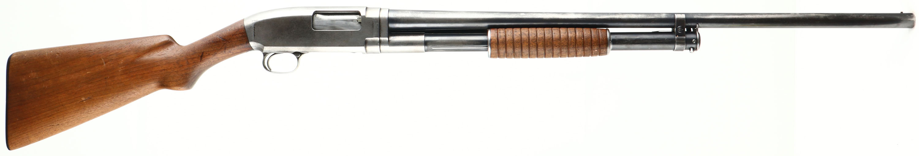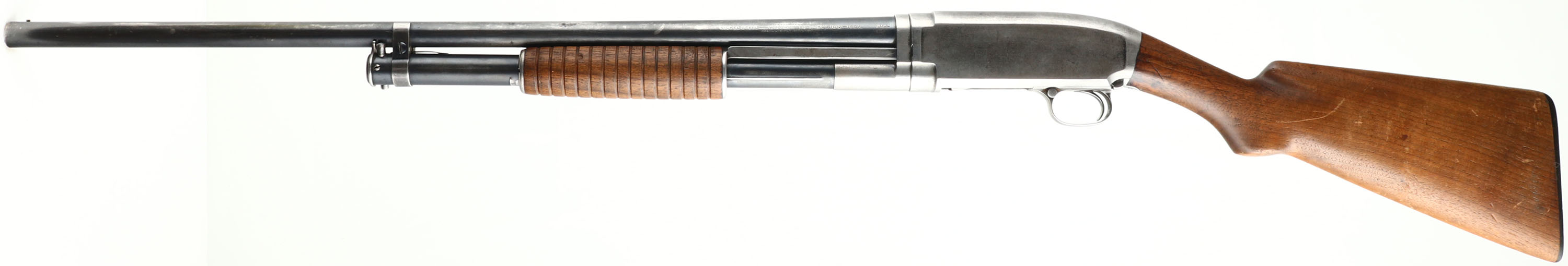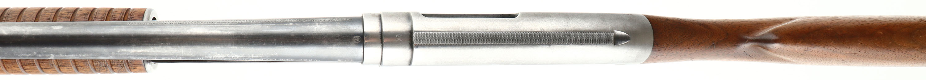 Winchester, Model 12, CAL: 16 GA, MFG: 1942, SN: 98677, Pump Action Shotgun, Choke: Full, 2 3/4'', 26'' Barrel. The original flat pistol grip wood stock & corncob forend are very good, displaying minor scratches, scrapes & contusions to a worn thin original finish. The original metal blue finish rates 50% on barrel & mag, while the receiver has worn fully gun metal gray. Bore is good & bright, but with spotty areas of fitting. Single front bead. Matted top of receiver. Buttstock carries a Winchester buttplate. LOP 13 3/8''. FFL or C&R Req. - Value: 300 to 600