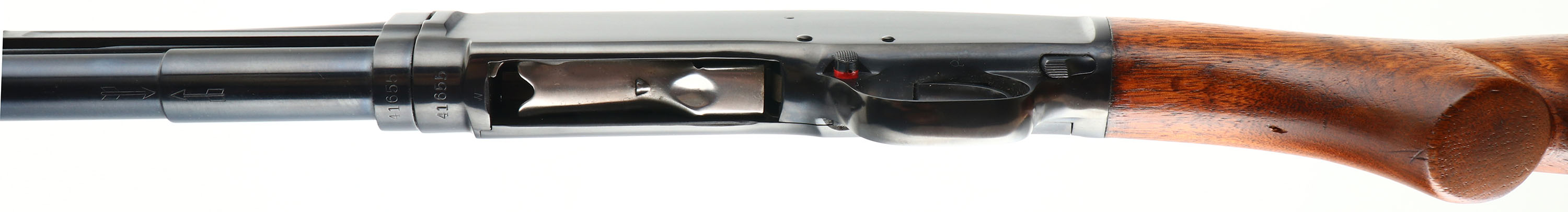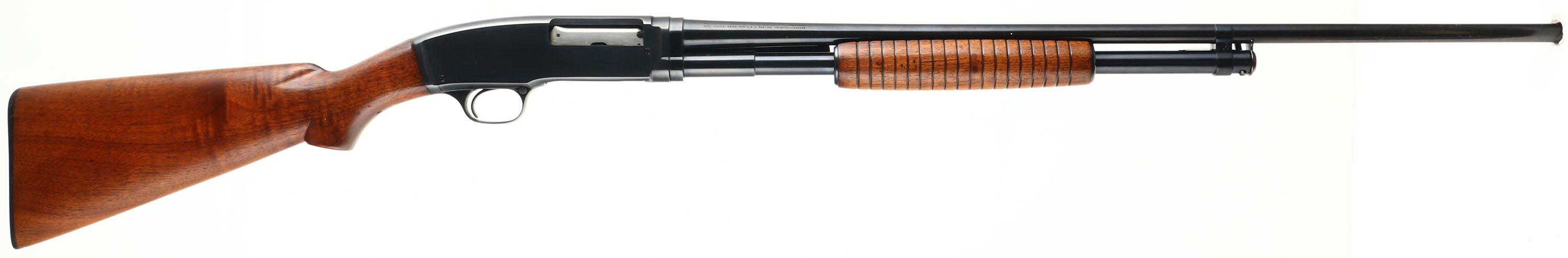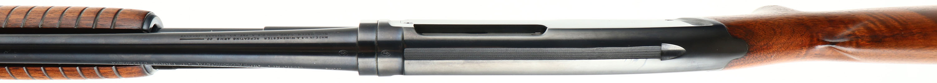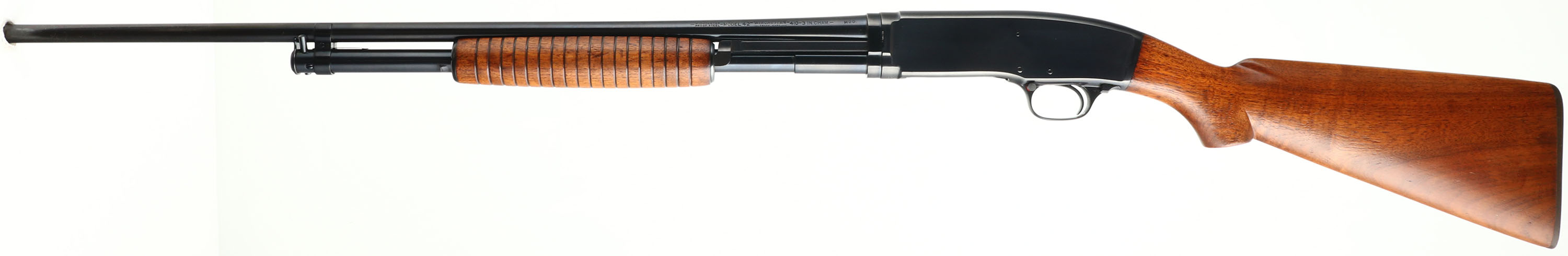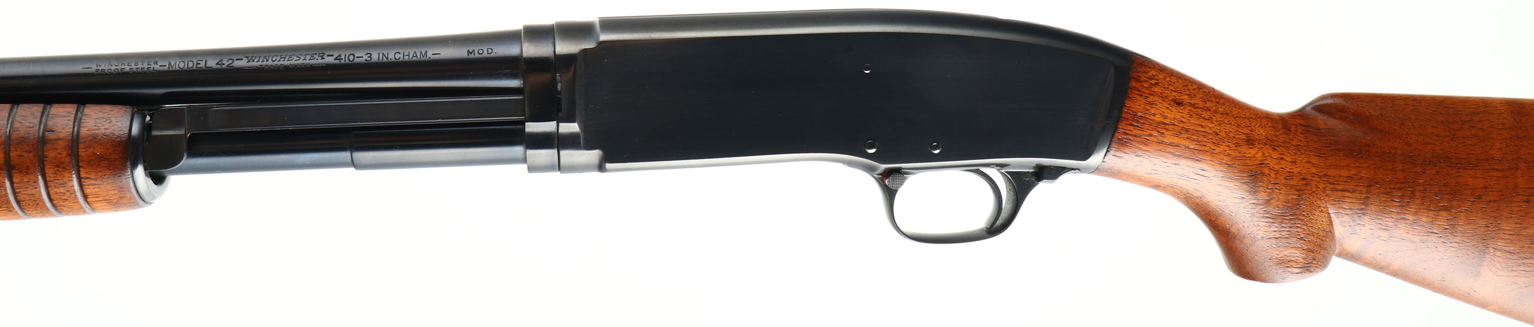Winchester Model 42, CAL: .410, MFG: 1940, SN: 41655, Pump Action Shotgun, Choke: MOD, 26'' barrel. The original flat pistol grip wood stock, with corncob forearm, are excellent, with very few light handling marks to the original finish. The original metal blue finish rates 99% overall. Bore is excellent. The barrel holds a single front bead. Buttstock carries a Winchester marked, checkered black plastic buttplate. There is a small 1/4'' chip at the toe. LOP: 13 7/8''. An excellent & very collectible example of an original Model 42. FFL or C&R Req - Value: 2000 to 3000