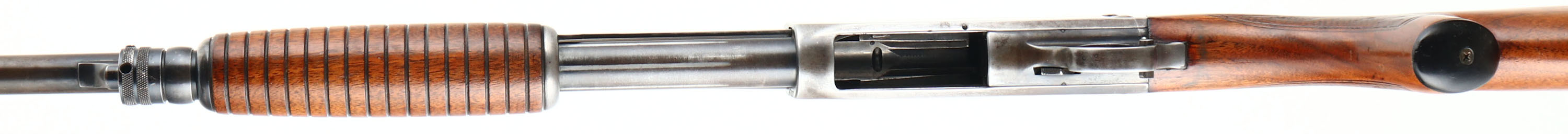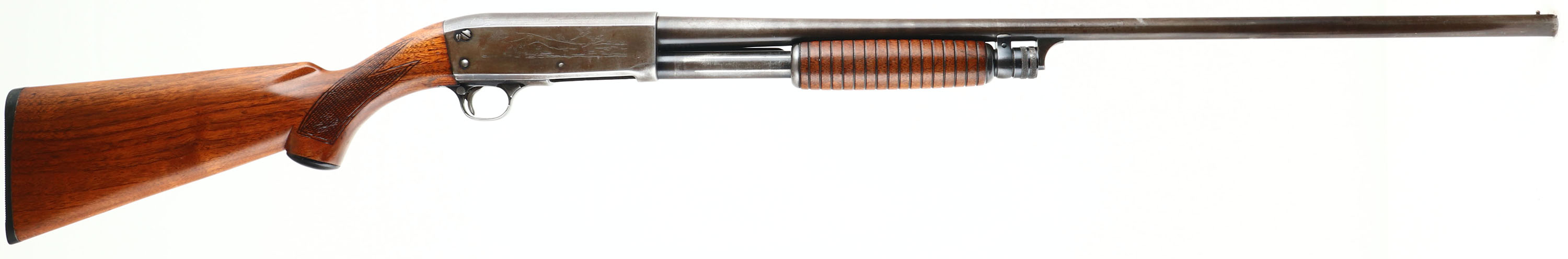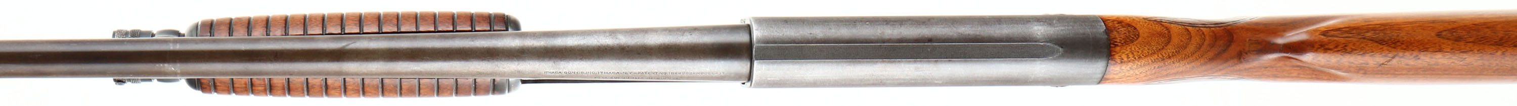 Ithaca, Model 37, CAL: 20 GA, MFG: 1949, SN: 247057, Pump Action Shotgun, Choke: Full, 2 3/4'', 28'' barrel. The original checkered & capped pistol grip wood stock & corncob forend are excellent & solid. They have been cleaned or lightly sanded, & carry an added layer of finish over the original finish, with very few remaining light scuffs or handling marks. The original metal blue finish has worn of faded mostly gun metal gray, with a thin layer of brown patina. Bore is excellent & bright. The barrel holds a single front bead. Buttstock carries a grooved black plastic buttplate. LOP 14''. FFL or C&R Req. - Value: 300 to 600