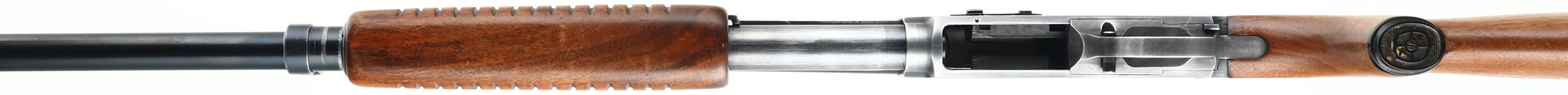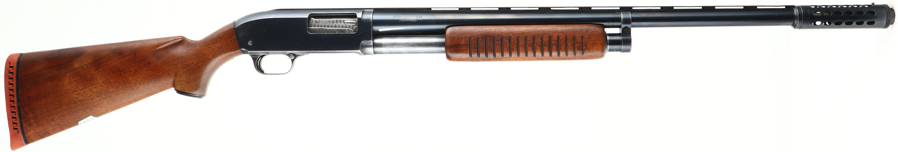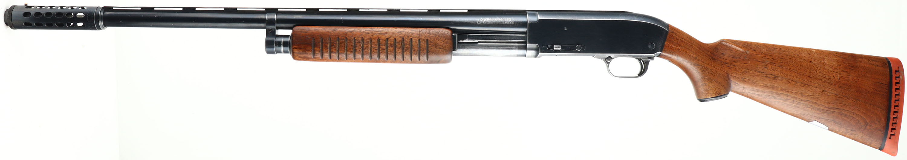 J.C. Higgins, Model 20, CAL: 12 GA, MFG: 1946-61, SN: None, Pump Action Shotgun, J.C. Higgins Power Pac Choke, 2 3/4'' Chamber, 22 1/4'' Ventilated rib barrel. The original capped pistol grip wood stock & long corncob forend are excellent, displaying a few minor scrapes & scratches to the original finish. Blank silver initial shield in belly of the stock. The original metal blue finish rates 85% on the barrel, 80% on the receiver, with the trigger guard worn silver. Bore is excellent. Has magazine cutoff switch on the left side of the receiver. The rib's middle bead has been smoothed off & a brass front bead. Buttstock carries a ventilated recoil pad. LOP: 13 1/2'' overpad. FFL or C&R Req. - Value: 150 to 300