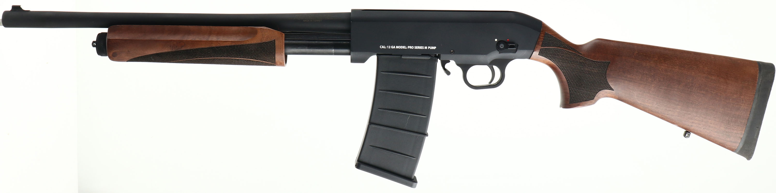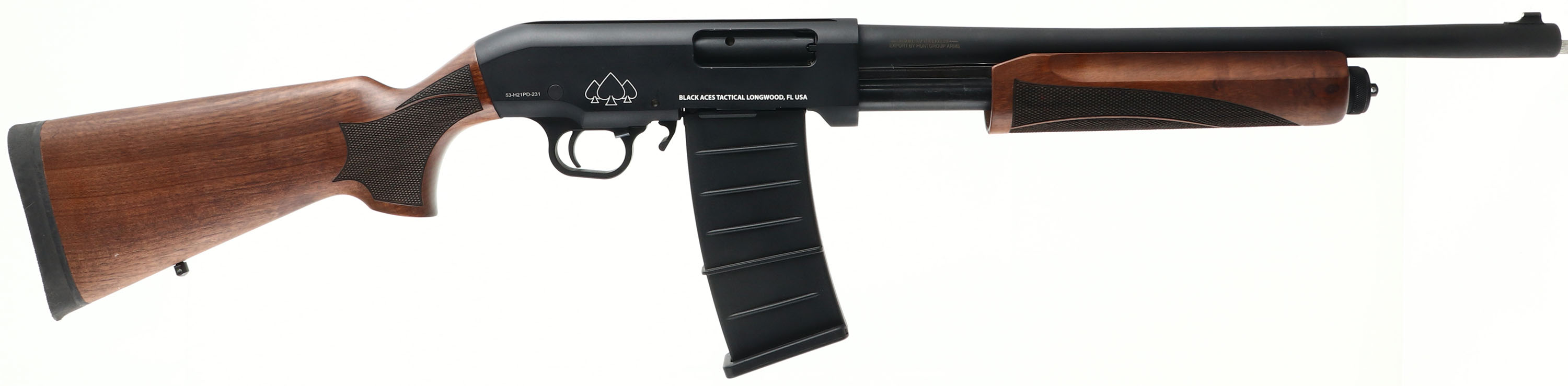 Black Aces Tactical, Model Pro Series M Pump, 12 Ga., MFG. Modern, SN: 53-H21PD-231, Mag Fed Pump Action Shotgun, Cylinder lined screw-in choke, 2 3/4'' & 3'' chamber, 18 3/4'' barrel. 5+1 rounds. The original factory checkered & flat pistol grip walnut stocks are excellent. There is a small chip at the bottom edge of the pistol grip & a couple of tiny contusions to the original finish. Original metal finish is 99% overall. Bore is very good. Single front sight. Solid recoil pad. Sling studs. An excellent home defense shotgun. 5 round mag. LOP 14 1/4'' over pad. FFL Req - Value: 250 to 450