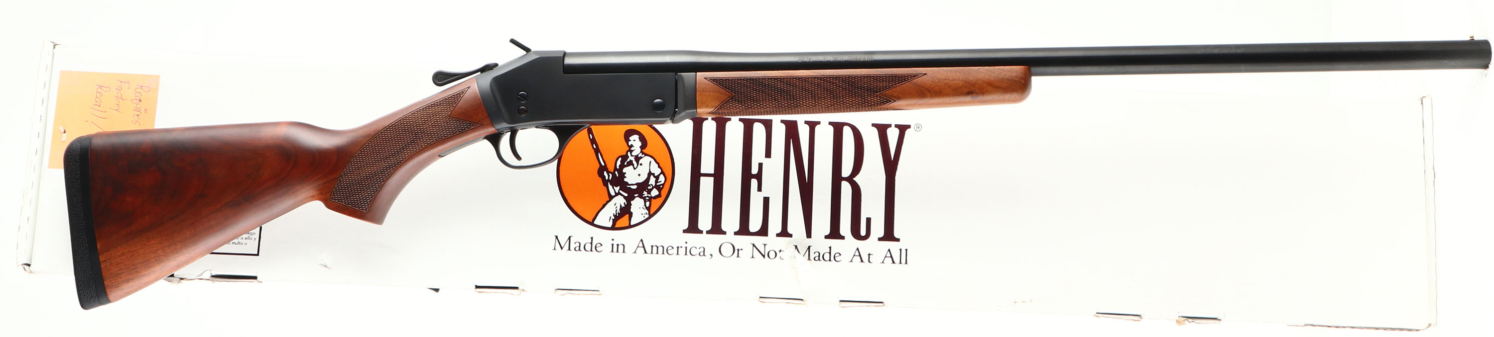 BOXED & NEW, Henry Repeating Arms, Model Henry Single Shot H015Y-20 (Youth Model), CAL: 20 GA, MFG: Modern, SN: 20SSSY00131, Break Action Single Shot Shotgun, Choke: screw-in FULL, 3'' Chamber, 26'' barrel. The original checkered & flat pistol grip wood stocks & original finish are mint. The stocks display fantastic grain. The metal blue finishes rate 99% overall. Bore is mint. Single front bead. Buttstock carries a solid recoil pad. Comes in its original box, with choke tool, booklet & sleaves. New gun shop inventory, never sold to public, NOS. Henry has issued a recall for repair on these H015 shotguns, which not been done to this shotgun. RECALL: The Issue & Fix: Under certain conditions, it is possible that some of these shotguns may discharge without the trigger being pulled if the hammer is partially cocked & released. Henry has identified the cause of the issue, & it will be corrected by replacing various components of the fire control system when returned. Buyer should not fire this firearm until recall & repair at has occurred by manufacturer. FFL Req. - Value: 200 to 400