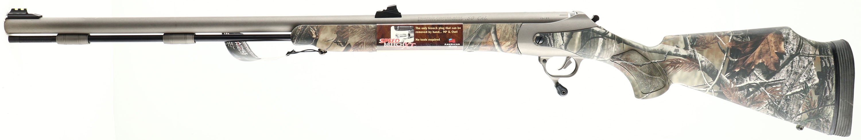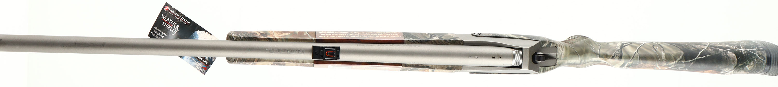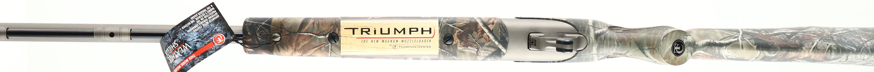 BOXED Thomson Center, Triumph Muzzle Loader, Cal. 50 Black Powder, Break Action, Mfg: modern, SN: 25709, 28'' barrel, Magnum muzzleloader, Weathershield, all purpose camo stock is mint, factory finish is 99%, has factory fiber optic sights front & rear, has been factory drilled & plugged for scop mount, sling studs, box has hang tags & paperwork. NO FFL Req. - Value: 300 to 500