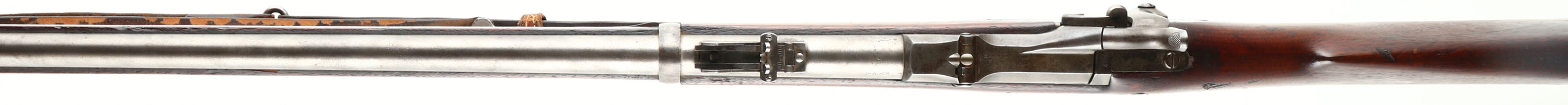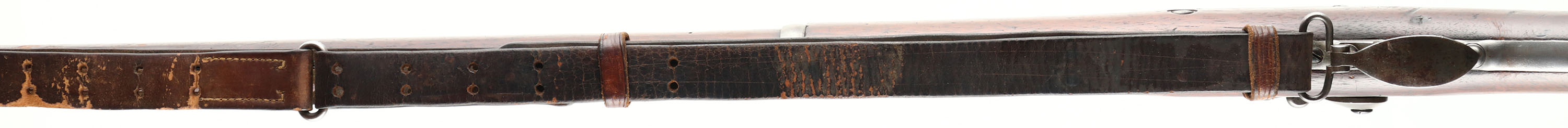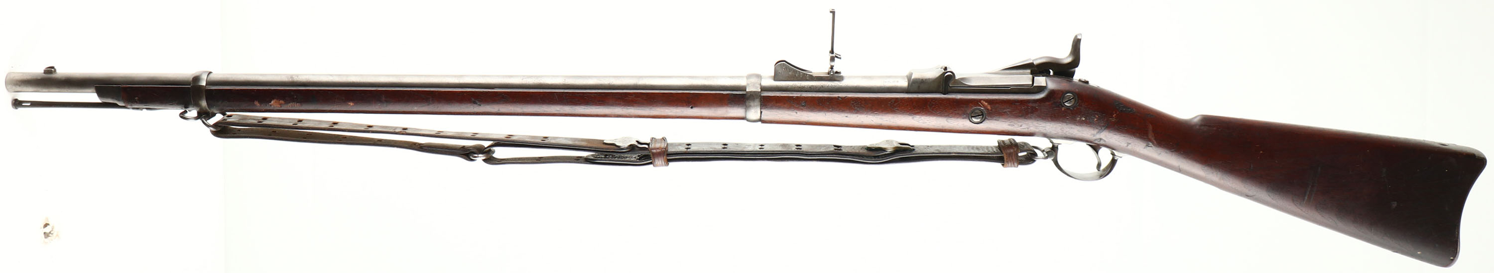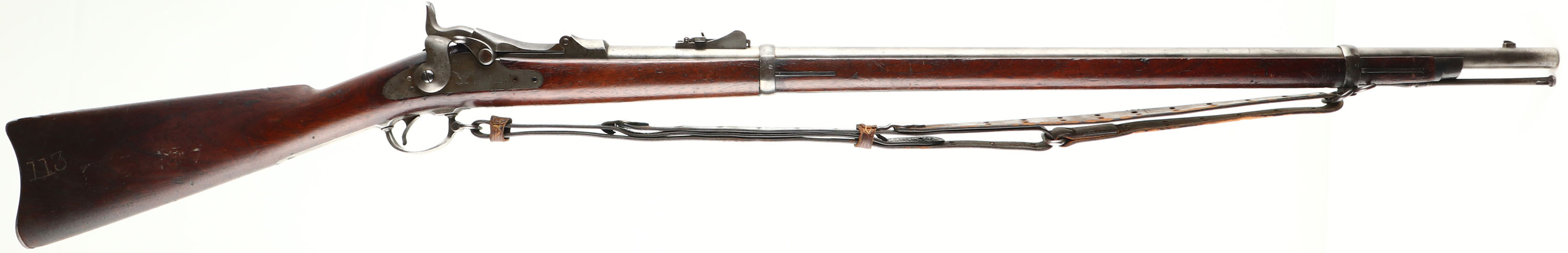 Springfield Armory, Model: 1873, Cal: .45-70, MFG: 1884, S/N: 257592, trapdoor breach loader, 32 1/2'' barrel. The straight wrist wood stock is very good, with light nicks, dings, dents, scratches, & wear from use/age, ''SWP'', ''1884'' in box, inspectors cartouche in left side of stock above trigger, ''P'' in circle cartouche in bottom of stock right behind lower tang, ''113'' marked into right side of stock by Butt plate. The metal finish on the barrel, breech block & lock plate has toned to a even gun metal gray with small spots of patina. Top of breach block is marked ''U.S.'', ''MODEL'', ''1873'', rear of receiver is marked with S/N, left side of barrel is marked ''V'', ''P'', over a Eagles head, ''P''. Bore is good, bright with lightly thinned rifling & light roughness in spots. Blade front sight with, U-notch ladder/tangent rear sight marked 1 to 5 on base & 6 to 12 on ladder. Metal Butt plate, has patina & cleaned pitting, top of tang is marked ''US'', bottom sling swivels with stacking swivel, has cleaning rod, comes with non period correct M1907 leather sling. Antique, No FFL Req. - Value: 500 to 1000