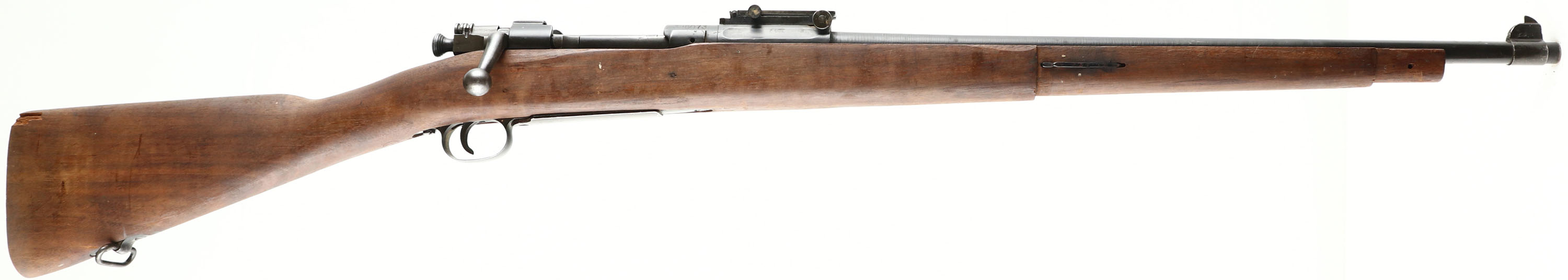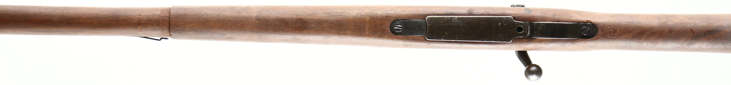 Rock Island Arsenal, Model: 1903, Cal: 30-06, MFG:1920. S/N: 385073. Bolt Action Rifle. 23 5/8'' Round Barrel. The straight wrist wooden stock is good, stock has been sanded down & no original finish remains, has light scratches, dings, dents, chips & wear from use/age, small chip in stock in top of stock by Butt plate, left side of stock above trigger is marked with us army ordnance crest & ''FJA'', ''P'' in circle marked into bottom of wrist of stock, bottom of stock in front of magazine is marked, ''8'' in circle, ''8'' in triangle, ''5'' in square & ''10'' in square, cartouches, stock is missing the upper handguard, barrel bands, & bayonet lug. The metal finish rates 80% overall with small spots of thinned bluing. Top of receiver is marked, ''U.S.'', ''ROCK ISLAND'', ''ARSENAL'', ''MODEL 1903'', S/N, Top end of barrel is marked, ''S A'', flaming bomb, ''7-28'', Remington made bolt. Bore is very good, bright with light roughness, 4 groove rifling. Blade front sight with, windage & elevation adjustable U notch ladder rear sight, marked 4 to 27 on top. Missing Butt plate. Rear bottom sling swivel. This would make a nice project rifle to compete into a full rifle with nothing being cut or destroyed. FFL or C&R Req. - Value: 400 to 800