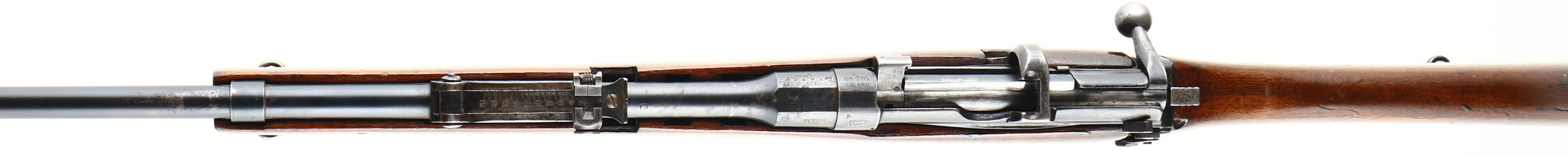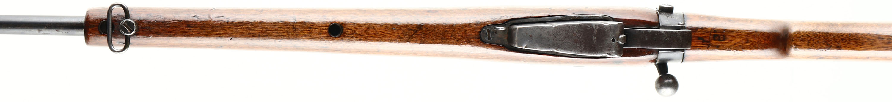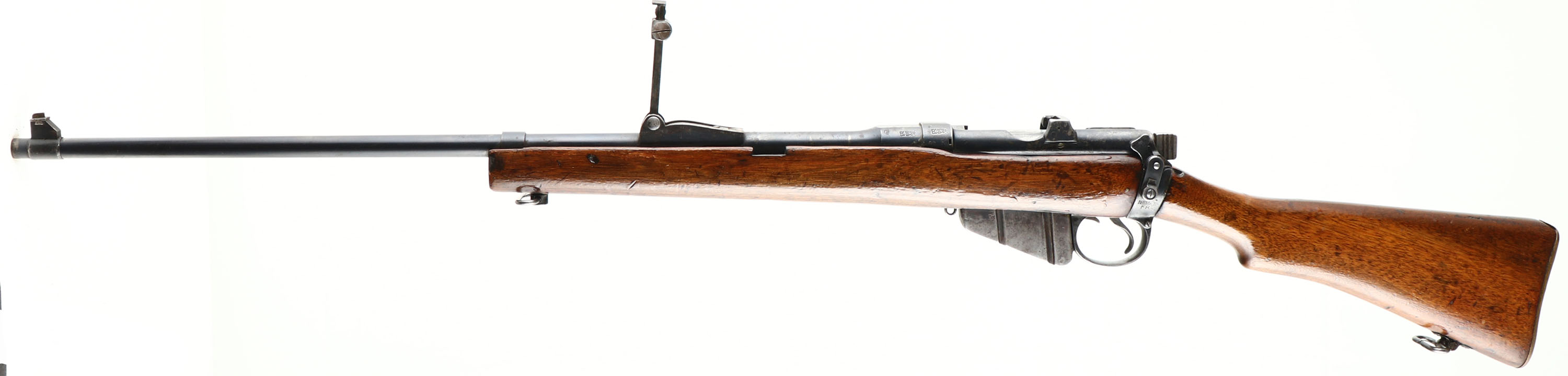 Ishapore, Model No1 Mk3*, Cal: .303 British, MFG: 1942, S/N: 39609Z, Bolt action rifle, 25 1/4'' Barrel. The cut down semi-Pistol grip wood stock is good, stock appears to have a high gloss finishes added overtop it, faint cartouche on right side of stock by cheek. The metal finish rates 50% overall with spots of thinning & patina. Left side of wrist band is marked ''NOIMKIII*'', ''FR42'', receiver band is marked with Ishipora proof mark, ''ENGLAND'', & S/N, Barrel is marked with proof marks. Bore is excellent. Blade front sight with tangent U-notch rear sight marked 2 to 20. Brass trapdoor butt plate. Bottom sling swivels. FFL or C&R Req. - Value: 150 to 300