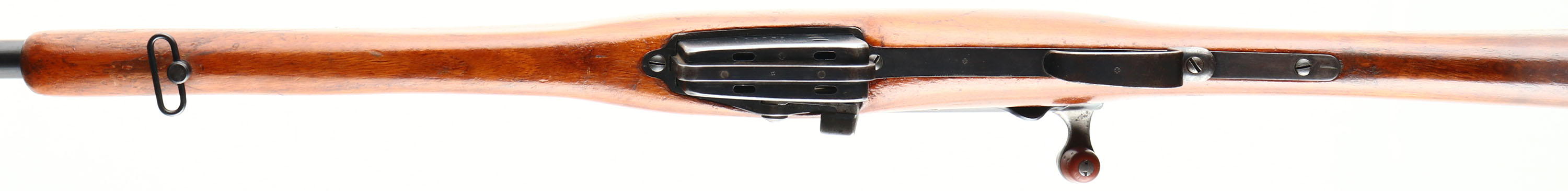 Waffenfabrik Bern (Swiss), Model: M1889, Cal: 7.5x53.5mmR, MFG: 1891-97, S/N: 116238, Bolt action straight pull rifle, 22'' cut down barrel. The cut down straight wrist wood stock is good, stock has been sanded, remolded in places, ''B'' above circle with ''1'' inside. The metal finish rates 80% overall with spots of patina & thinned bluing. Left side of receiver has been drilled & tapped for a scope, S/N, & Swiss cross, barrel is marked with S/N, Swiss cross, & other proof marks, Magazine cutoff has been modified to be a magazine release, S/N matched bolt, magazine, barrel, & Butt plate. Bore is excellent, bright & mirror like with little wear. Blade front sight with tangent modified aperture rear sight, base marked 300 to 500, aperture sight block has been added to older V-notch, top of base wings have been ground down to the 500 mark. Steel butt plate with light brown patina, upper tang is marked ''6'', Swiss cross, ''238''. Bottom sling swivels. This is a rare M1889 in it un-modified configuration, the M1889 was the Switzerland's first smokeless rifle, & was the first rifle in the line of the Schmidt-Rubin straight pull rifles. This rifle will chamber modern 7.5 Swiss ammo but the action is not strong enough for the increase of pressure, it is recommend to shave down modern 7.5 Swiss cartridges to the correct length and hand down-loaded them to shoot through this rifle. Antique No FFL Req. - Value: 150 to 300