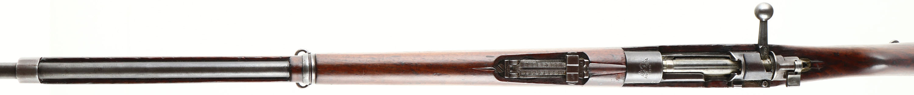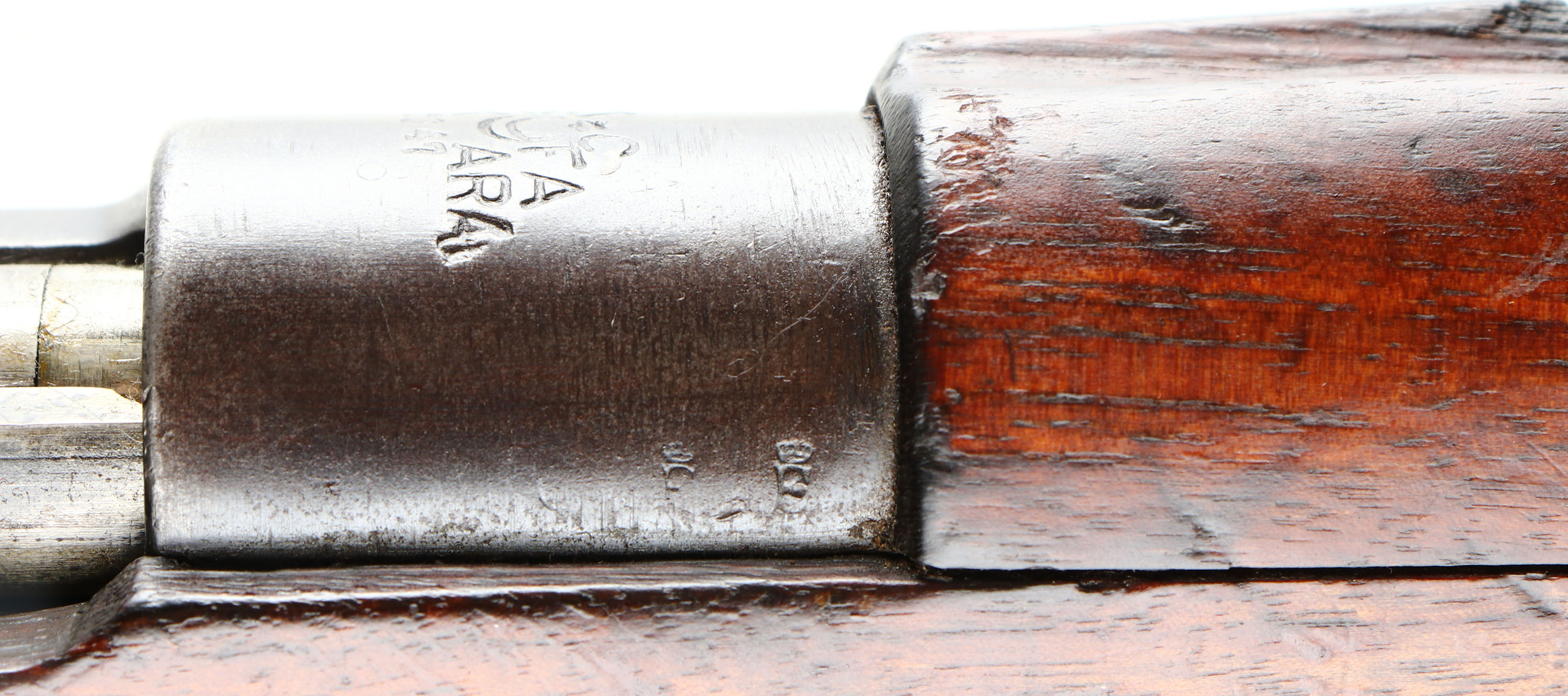 Asfa Ankara German Rebuild. Model: M38. Cal: 7.92x57mm. MFG: 1947. S/N: 1F26941. Bolt Action Rifle. 282/4'' Barrel. The semi pistol grip stock is very good with scratches, gouges, oil darkening & wear from use/age, hole in bottom of stock between barrel bands, hairline crack on bottom of stock that runs from rear barrel band to front barrel band retention spring, bolt disassembly disc in stock, rear barrel band's retention screw has been damaged and would need drilled out to remove it so you can take the stock off. The metal finish rates 70% overall with spots of thinned bluing. Left side of receiver is marked with S/N, top of receiver is marked ''T C'', ''AS FA'', ''ANK ARA'', ''1947'', Crescent Moon/ Stars, left side of receiver rail has a very faint ''GEW 98'' marking, right side of receiver band is marked with faint German proof marks, end of barrel is stamped with importer marks, S/N mismatched bolt, bolt & inside of action still have large amounts of original grease from when it was stored at the arsenal. Bore is very good, slightly dark with strong rifling. Barleycorn front sight, V-notch Tangent rear sight marked 1 to 20. Metal Butt plate with wear & brown patina. Bottom sling swivels, Missing cleaning rod. This rifle appears to originally been a German made Gew 98 pattern rifle that was re-arsenaled in 1947 by the Turks into their standard M38 patter, this was very common for the time since Turkey had many different Mauser rifle and converted them all into one standard pattern for easy of use & logistics. FFL or C&R Req. - Value: 200 to 400
