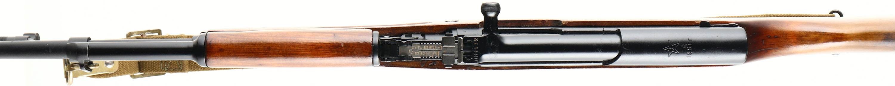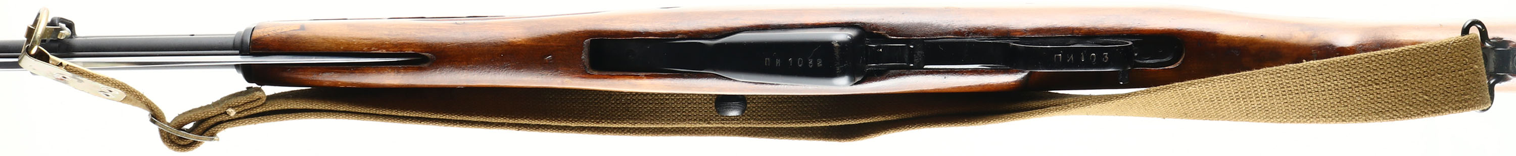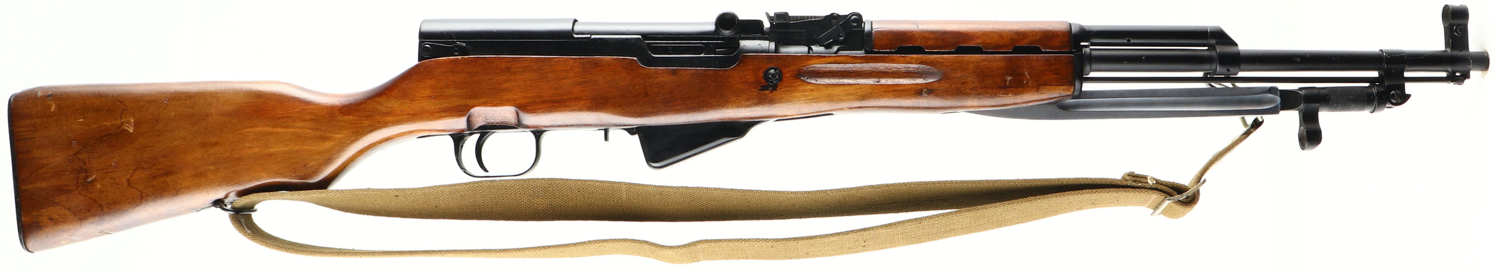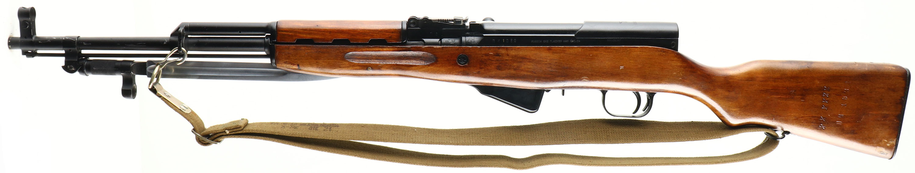 Tula, Model: SKS-45, Cal: 7.62x39, MFG: 1951, S/N: nN1032, Semi-auto Rifle, 20 3/8'' Barrel. The semi-Pistol grip wood stock is very good, stock appears to be a factory replacement done when it was re-arsenal, stock has two 1'' x 1/4'' inlaid wood repairs on bottom sides of stock by bayonet, one on each side, lots of various cartouches on stock, left side is marked with the Tula arsenal star, ''1954r'', ''XX XXXX'', & S/N, top rear of stock is marked with a square cartouche with non-legible letters inside, ''P'', ''O'', ''2'', one faint stamp on right side of stock, bottom of wrist is marked with a ''10'', ''5'' in square, stock has various nicks, dings, dents, scratches, & wear from use/age. The black paint finish was added when Russia re-arsenal the rifles & it is 95% with light scratches & wear marks. Top of receiver cover is marked with Tula arsenal star stamp, ''1951r'', left side of receiver is marked with proof marks, S/N, & importer marks, right side of receiver is marked with proof marks, rear of barrel is stamped with proof marks, Bolt, magazine, & trigger guard are all S/N matched. Bore is Excellent with very little wear. Hooded front sight post, tangent U-notch rear sight marked 1 to 10. Steel trapdoor Butt plate with full cleaning kit inside, Butt plate has scratches & wear. One bottom & one side sling mount, comes with a orginal surplus Russian sks sling. A excellent collectors piece that's in very good condition. FFL or C&R Req. - Value: 600 to 1200