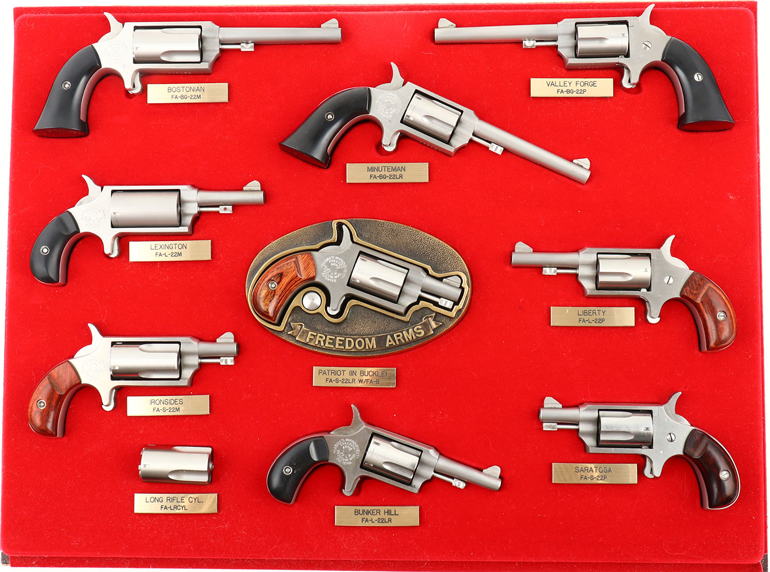 RARE CASED DEALER SET, Freedom Arms, ''The Gun You Never Have To Be Without'' 9 Casull's Improvement Mini Revolver set, plus extra Cylinder. This is a rare opportunity to purchase a complete 1980's Freedom Arms wood ''Dealer'' counter display / merchandiser, with nine original & mint to near mint Casull's Improved mini revolvers (one with mounting belt buckle), an extra LR cylinder, 9 original zipper pouches, & complete paperwork. The revolvers included are (3) setup for .22 Mag with 4 rd cylinders, & (6) which are .22 LR or Short with 5 Rd cylinders. The models have barrel lengths between 1 1/8'' to 3''. 5 revolvers carry their original black plastic grips, while the other 4 carry original wood grips. The revolvers are constructed of stainless steel, & carry serrated triggers & original front sights. The set include models: Bostonian .22 Mag 3'', Lexington .22 Mag 1 3/4'', Ironsides .22 Mag 1 1/8'', Minuteman .22 LR 3'', Patriot (mounted in buckle) .22 LR 1 1/8'', Bunker Hill .22 LR 1 3/4'', Valley Forge .22(P) LR 3'', Liberty .22(P) LR 1 3/4'' & Saratoga .22(P) LR 1 1/8''. All are mint to near mint (mild handling marks) & come displayed on they original red display insert, within the original wood & glass key locking display case. Under the display board is the space where the 9 zippered cases are stored. These counter display sets were only made available to dealers to help facilitate sales. Freedom Arms is a Freedom, Wyoming based firearm manufacturing company, known for producing powerful single-action revolvers. The company was founded in 1978 by Wayne Baker & Dick Casull to produce the Mini-Revolver, then later a revolver chambered in Casull's powerful .454 Casull revolver cartridge. Freedom Arms' first offering was a 5-shot mini revolver in .22 LR known as ''The Patriot''. It was later offered in .22 Short & .22 Winchester Rimfire Magnum. A belt buckle holster version was patented by Richard J. ''Dick'' Casull to accommodate the small revolver. A Boot Pistol model was available with a longer barrel. A 4-shot mag mini revolver was also produced by Freedom Arms. All of which are included in this offering. Production of mini-revolvers by Freedom Arms ceased in 1990 when the mini-revolver design was sold to North American Arms. These are real mini revolvers, which fire real production ammo & carry their own Serial Number. These are not toys & do require an FFL background check for each revolver. These original Freedom Arms mini revolvers have become quite collectible & this set of nine in their original display case & in near new condition is very rare & very collectible. FFL Req. - Value: 3000 to 5000