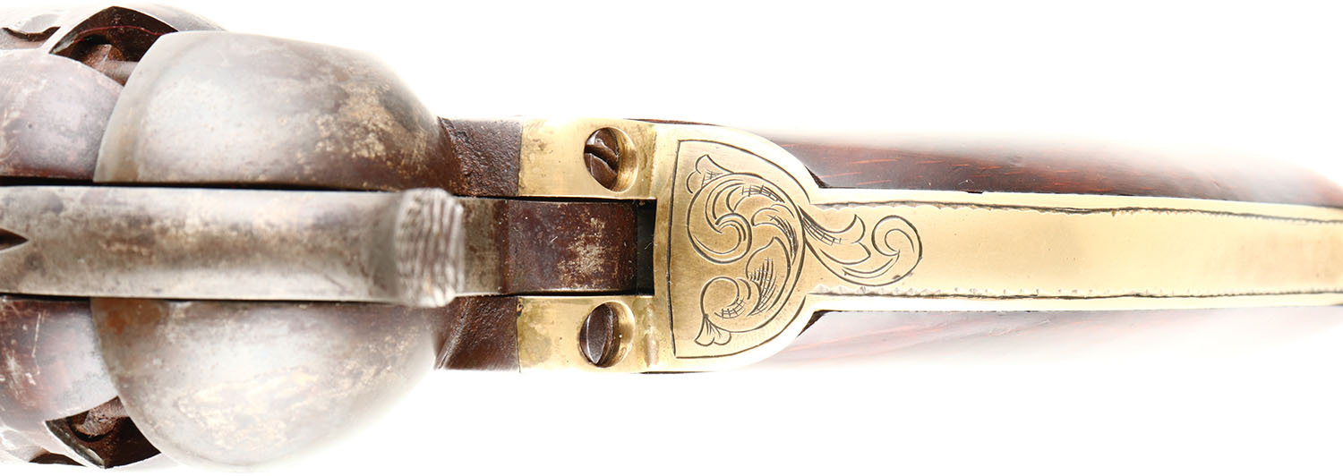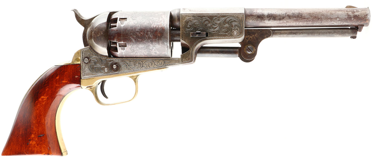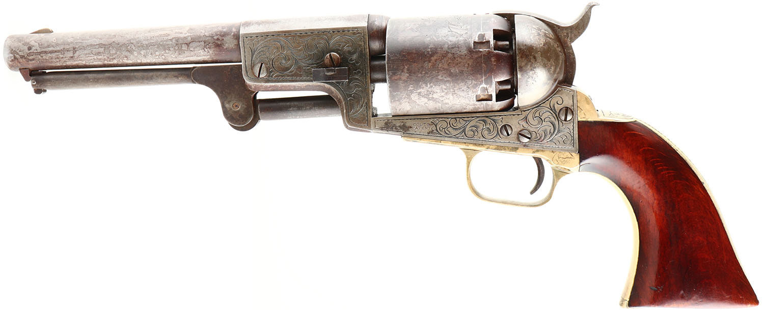DESIRABLE & ENGRAVED, Colt, 3rd Model Dragoon, CAL: .44, MFG: 1853 SN: 13579, Single Action Revolver, 7 1/2'' barrel. Colt only produced 10,500 of these pistols from 1851-61, with the serial number range being from 10,200 - 19,600. This particular example carries all matching serial numbers. The wood grips are very good, as having been sanded & refinished leaving the metal proud to the wood. They display minor contusions & handling marks. The metal finish has worn to a mix of metal gray & brown patina. The brass trigger guard/grip has been polished & cleaned, with a thin aged patina. The frame, barrel housing, backstrap & trigger guard/grip all display fantastic custom, ornamental scroll hand engraving. The cylinder displays the Texas Ranger & Indian fight scene. Bore is excellent. Barrel has brass blade front sight. A rarely seen Dragoon & one with strong eye appeal. Antique, No FFL Req. - Value: 7500 to 15000