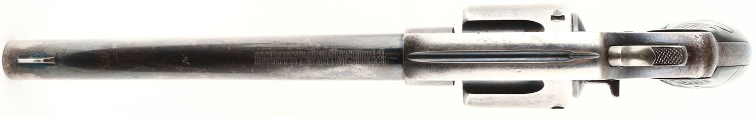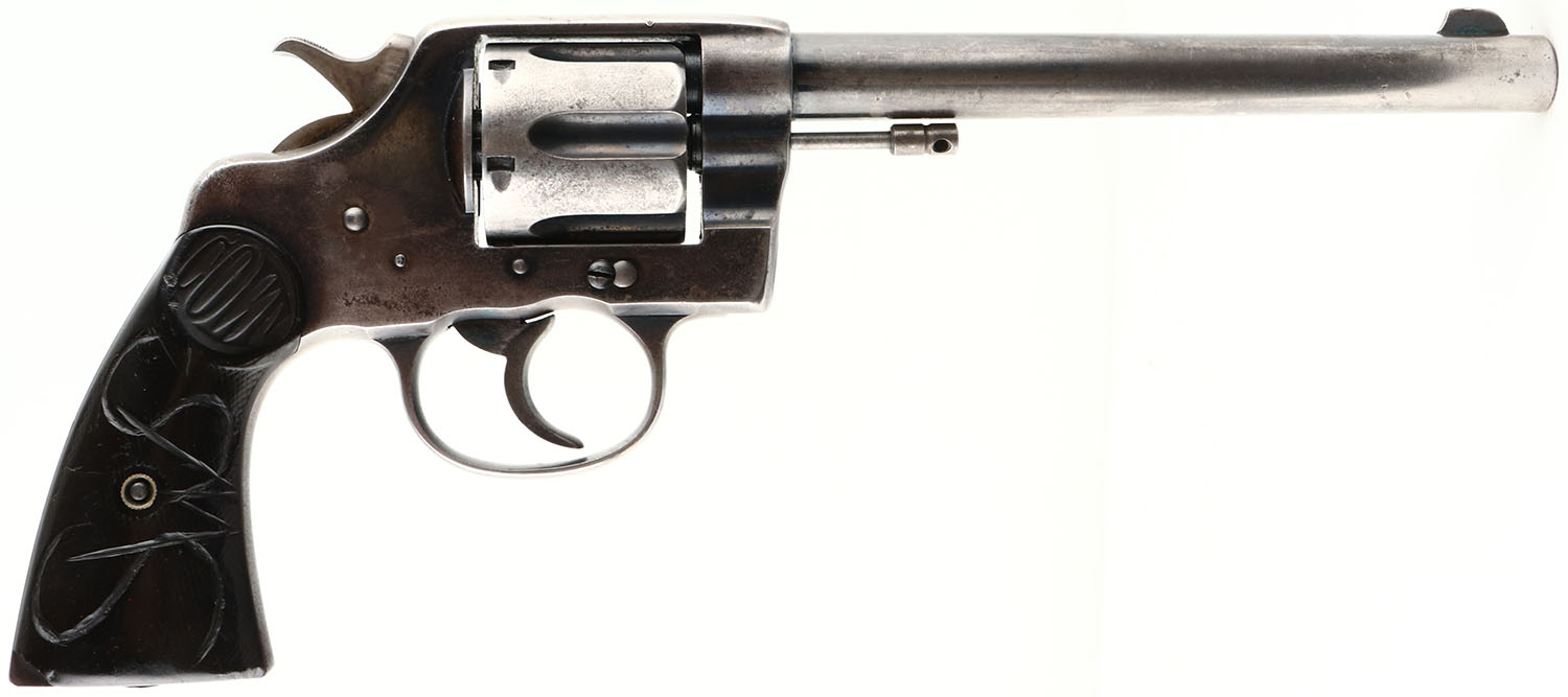 Colt, New Service, CAL: 44 Cal. (44-40), MFG: 1904, SN: 12113, Double Action Revolver, 7 1/2'' barrel. The checkered on the ''COLT'' plastic grips has worn mostly smooth & the initials ''SWS'' are carved into the right grip & the date ''JULY 1919'' into the left grip. The bottom corners of each grip have a 1/4'' missing chip. The original metal blue finish has worn mostly gun metal gray, with thinned blue & a thin brown patina remain in frame & cylinder on protected areas. Bore remains very good & bright. The barrel holds a blade front sight. Butt missing lanyard swivel. Action & cylinder are tight & timing functions properly. An original, well used & loved New Service with lots of stories to tell & lots of quality life remaining. FFL or C&R Req. - Value: 400 to 800