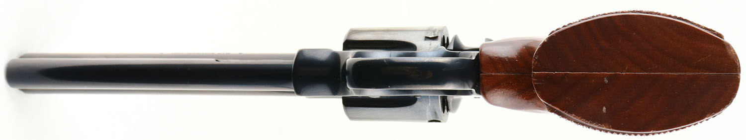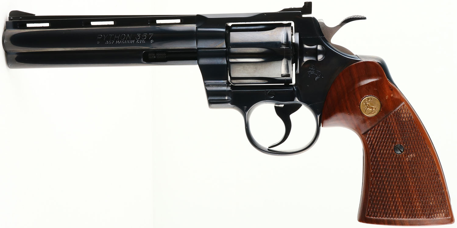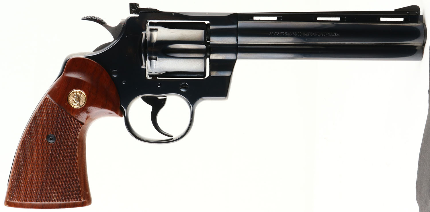 Colt, Python, CAL: 357 MAG, MFG: 1979, SN: V38222, Double Action Revolver, 6'' barrel. The Colt Python was introduced as a premium model in 1955, in caliber .357 Magnum. The Python is built on the large I-frame & has a reputation for accuracy, smooth trigger pull, & a tight cylinder lock-up. It has a 6-shot swing-out cylinder & was available in Python blue, Royal blue, Python nickel & Python stainless steel finishes. Some firearm collectors & writers have described the Python as ''the finest production revolver ever made''. It has a wide serrated target hammer, ventilated rib, & fully adjustable target quality rear sights. The left side of barrel is stamped in two lines ''PYTHON 357 * .357 MAGNUM CTG * ''. The Rampant Colt gold medallion, checkered walnut grips on this example are mint. The high polish blued finish is excellent, rating 99%, with a faint drag line. Bore is excellent, near mint. The satin finished top of the ventilated rib barrel holds a screw height adjusting ''U'' notch rear sight & front blade sight. This pistol is very collectible when found in this high of condition. FFL Req. - Value: 2200 to 3000