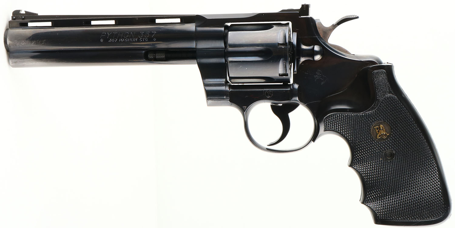 Colt, Python, CAL: 357 MAG, MFG: 1971, SN: E30211, Double Action Revolver, 6'' barrel. The Colt Python was introduced as a premium model in 1955, in caliber .357 Magnum. The Python is built on the large I-frame & has a reputation for accuracy, smooth trigger pull, & a tight cylinder lock-up. It has a 6-shot swing-out cylinder & was available in Python blue, Royal blue, Python nickel & Python stainless steel finishes. Some firearm collectors & writers have described the Python as ''the finest production revolver ever made''. It has a wide serrated target hammer, ventilated rib, & fully adjustable target quality rear sights. The left side of barrel is stamped in two lines ''PYTHON 357 * .357 MAGNUM CTG * ''. The upgraded gold logo medallion Pachmayr ''GRIPPER'' rubber grips are excellent. The high polish blued finish rates 90%, with holster wear at & around the muzzle, the cylinder & sides of the frame. Bore is excellent. The frame holds a screw height adjusting ''U'' notch rear sight & the ventilated rib holds a serrated front blade sight (missing orange insert). This pistol would be a great addition to a shooters collection. FFL Req. - Value: 1400 to 2000