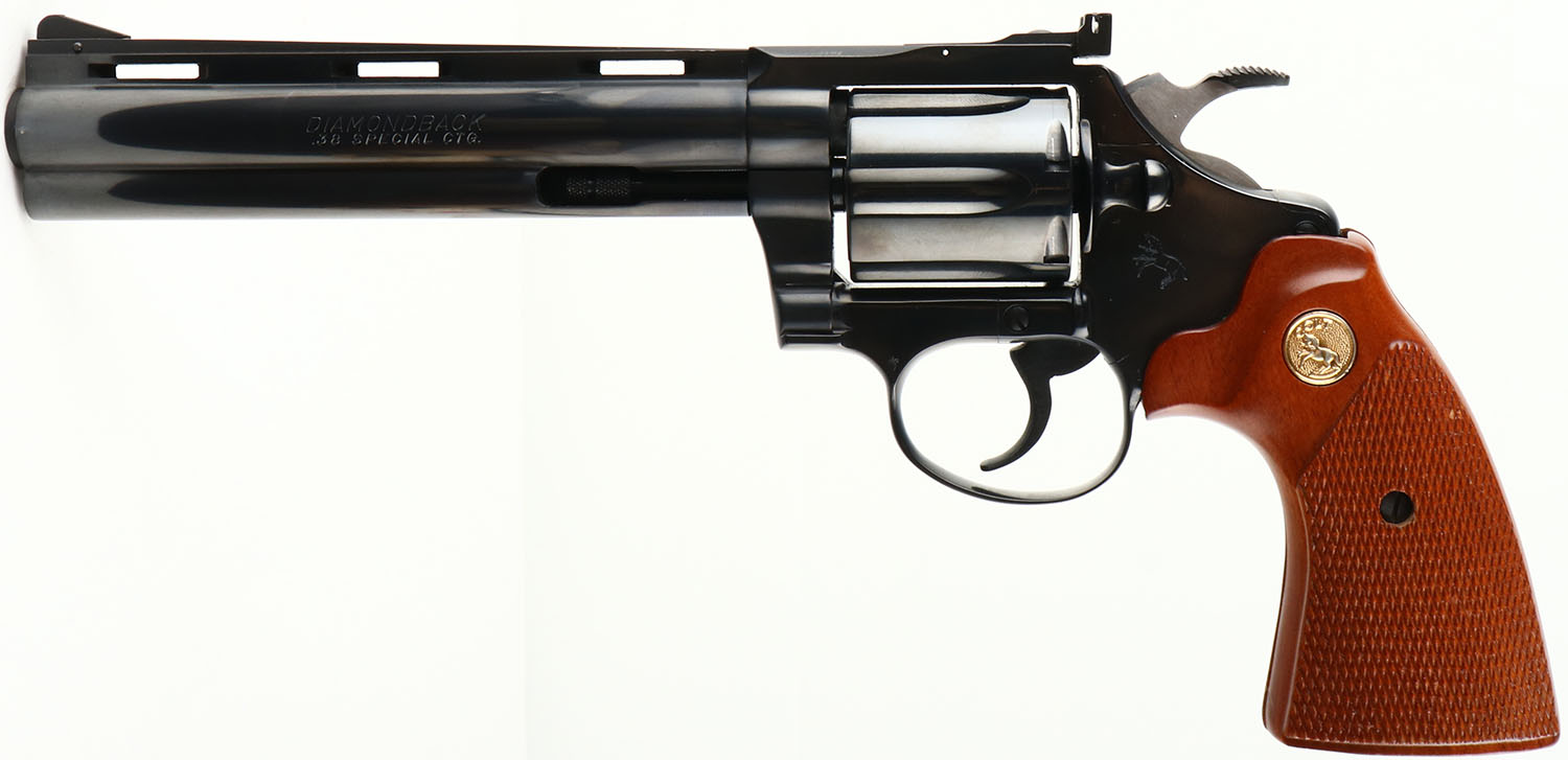 NEW BOXED, Colt, Model Diamondback, (D5560) CAL: 38SPL, MFG: 1981, SN: S78555, Double Action Revolver, 6'' barrel. The Colt Diamondback was introduced as a deluxe model in 1966, inspired by the successful Colt Python, in calibers of .22 LR, .22 WMR & .38 SPL. The Diamondback is built on the smaller ''D frame'', same as used in the Detective Special. It has a 6-shot swing-out cylinder & was available in blue or nickel finishes. It has a wide serrated target hammer, ventilated rib, fully adjustable target quality sights, & full-length barrel underlug. The left side of barrel is stamped in two lines ''DIAMONDBACK .38 SPECIAL CTG''. They came with Colt brass medallion, checkered Walnut grips. The grips on this example are mint. The high polish metal blued finish is mint. Bore is mint. The matte finished top of the ventilated rib barrel holds a screw height adjusting ''U'' notch rear sight & front blade sight. This gun comes in its original Colt wood grain box, with Colt documents. Consigned by original buyer who claims it was never shot outside factory test. NOS. Nearly Mint in every way & extremely collectible. FFL Req. - Value: 2000 to 3000