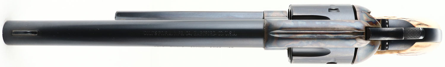 BOXED Colt, Single Action Army (P1870), CAL: .45 COLT, MFG: 1978-93, SN: SA11751. Single Action Revolver, 7 1/2'' barrel. The top of the barrel is marked ''COLT'S PT F.A. MFG. CO. HARTFORD CT. U.S.A.'', The left side of the barrel is marked ''COLT SINGLE ACTION ARMY 45''. The left side of the frame is marked with the Rampant Colt logo above the trigger guard & next to patent dates. The full SN can be found on the frame. The fantastic original stag & gold Rampant Colt medallion grips are excellent. The factory metal blue finishes rates 99%. The case-hardened frame displays vivid case-colors. Bore is excellent & bright. The barrel holds a blade front sight. Comes in the original factory wood grain box, with unopened original documents. Box has tape repairs on the ends. FFL Req. - Value: 1500 to 2500