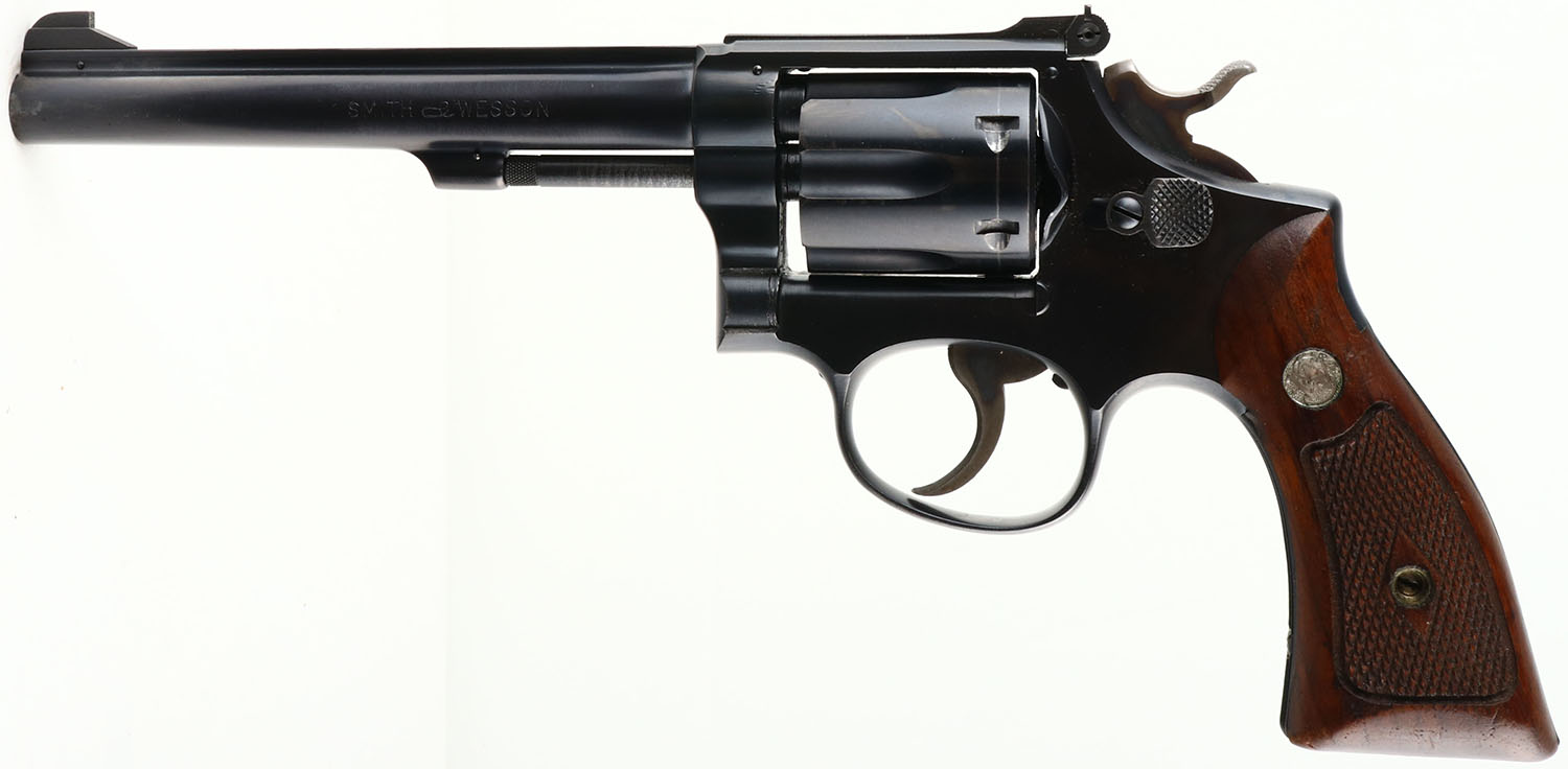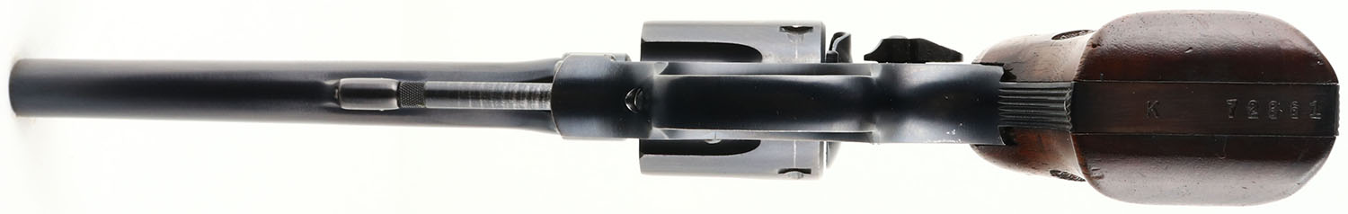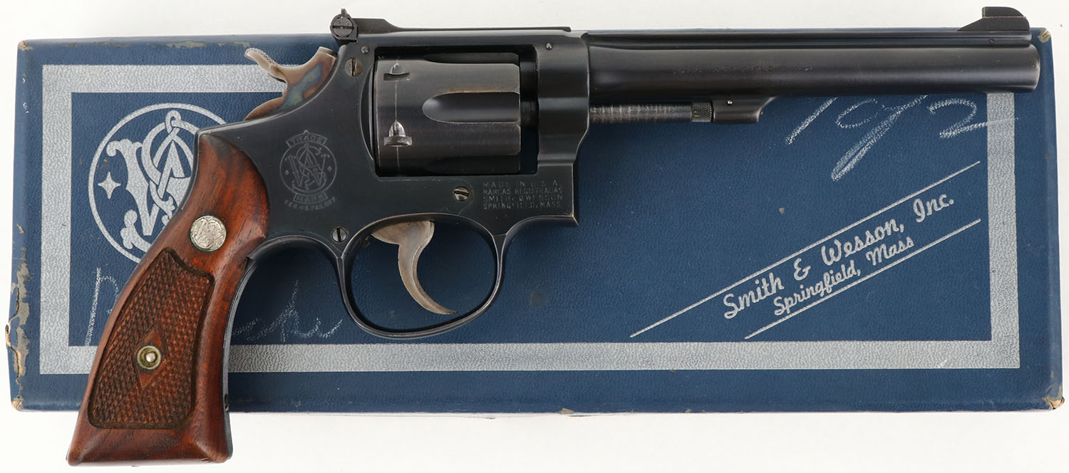 BOXED, Smith & Wesson, Model K22, CAL: .22 LR, 5 Screw, MFG: 1948, SN: K72861, Double Action Revolver, 6'' barrel, The checkered walnut grips are excellent, with light overall wear. The metal blue finish rates 97%. There is a small area of touch-up on the left side of the frame ahead of the cylinder. The case-hardened hammer & trigger retain full case-colors. Bore is excellent. The frame has an adjustable rear sight & the barrel has a serrated blade front sight. Grooved backstrap & front strap. FFL or C&R Req. - Value: 600 to 1200