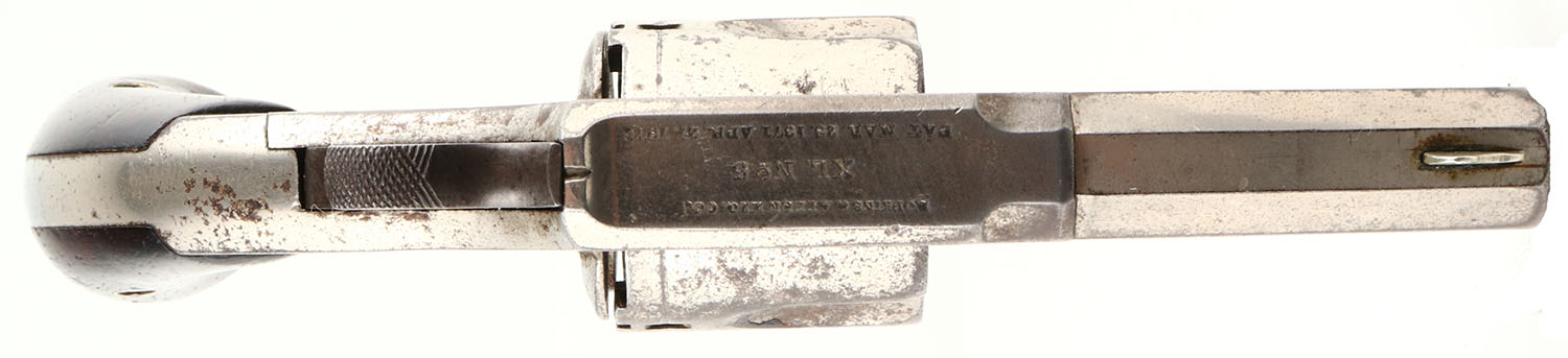 Hopkins & Allen, Model XL No. 5, CAL: 38, MFG: 1879-1900, SN: 3342, Single Action Revolver, 2 1/2'' barrel. The wood grips are very good. There are minor contusions, scrapes & dings. The original nickel finish rates 50%, with areas worn to metal & toned to a brown patina. Top of frame marked, ''HOPKINS & ALLEN MFG. CO.'', ''XL.NO 5'', ''PAT. MAR. 26. 1871 APR. 27. 1875''. Right bottom of barrel marked, ''3342''. Bore is fair, with intermittent pitting amongst strong rifling. The frame has a small notch groove & the barrel has a modified blade front sight. Antique, No FFL Req. - Value: 200 to 350