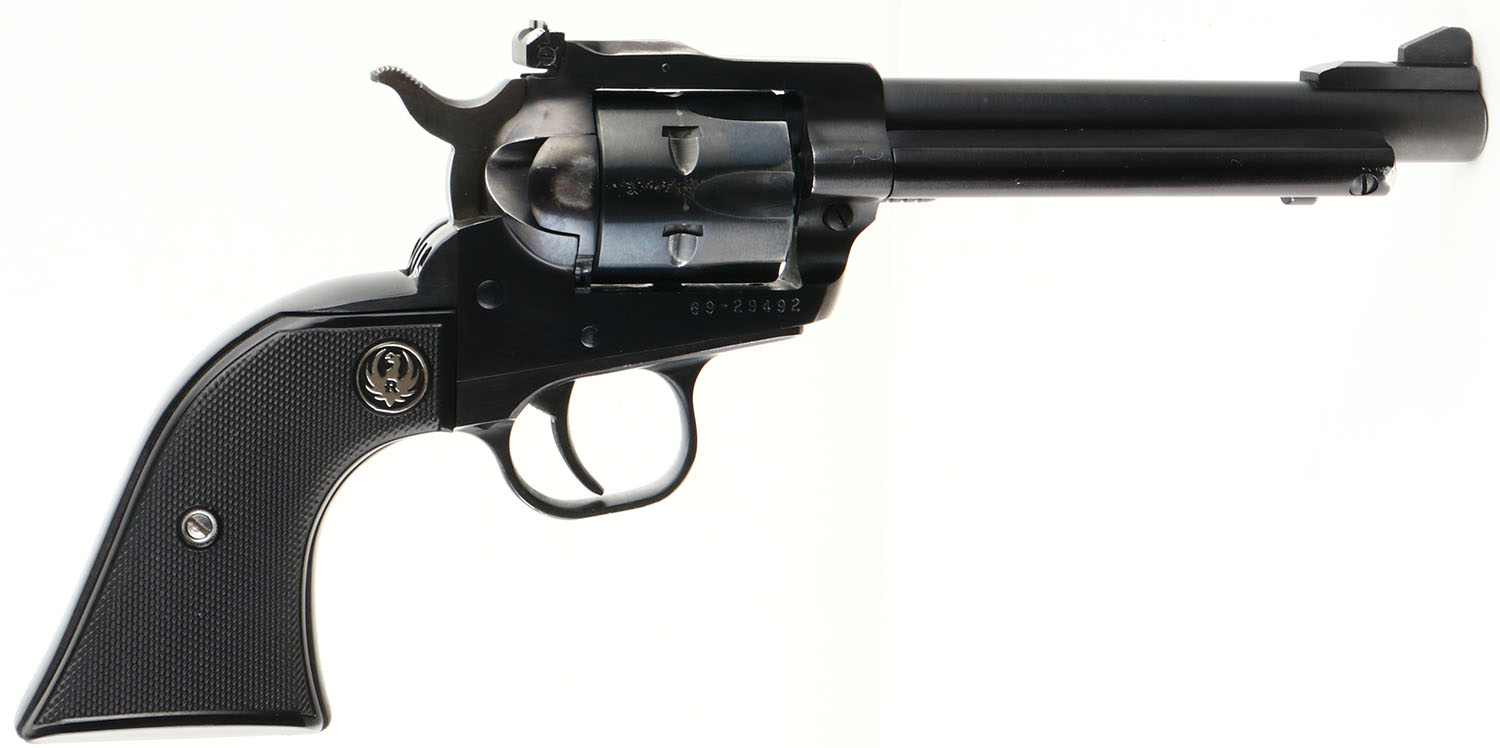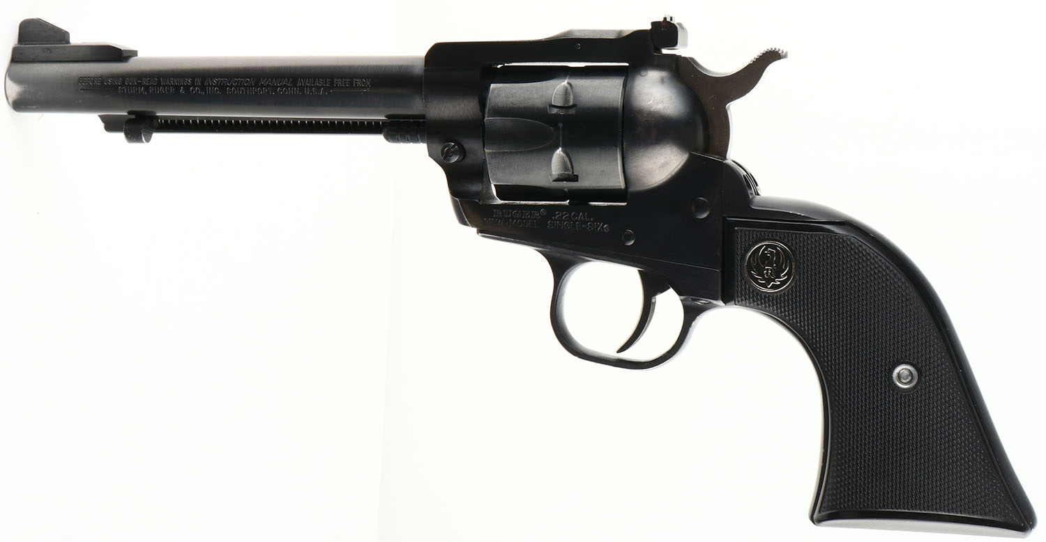 Ruger New Model Single Six, CAL: 22 LR, MFG: 1982, SN: 69-29492, Single Action Revolver, 5 1/2'' barrel. The black Ruger medallion grips are excellent, near mint. The metal blue finish rates 95% overall, with loss mostly at muzzle & shoulders behind cylinder. Bore is excellent. Factory sights. Action & cylinder timing excellent. FFL Req. - Value: 400 to 800
