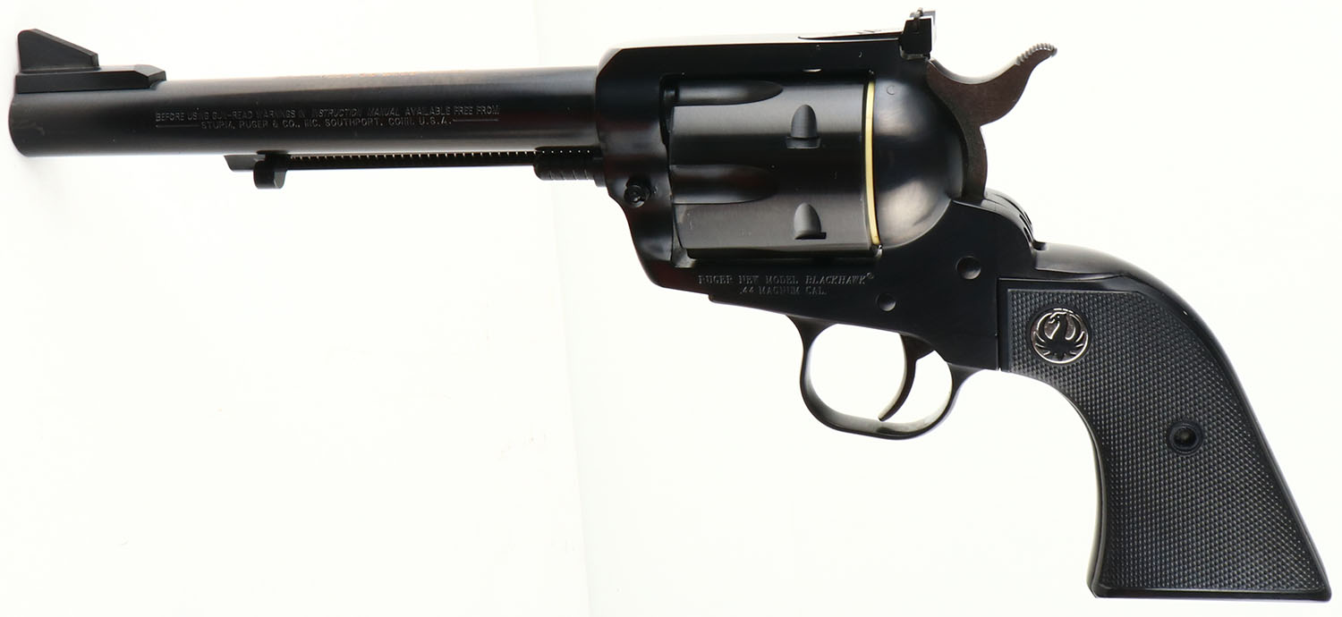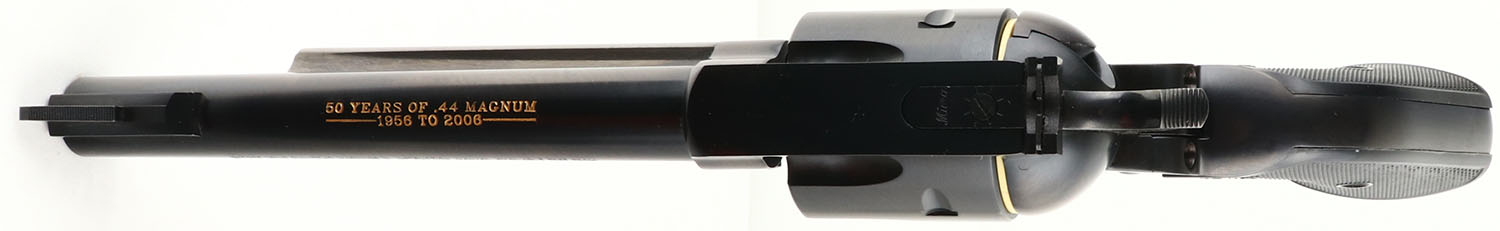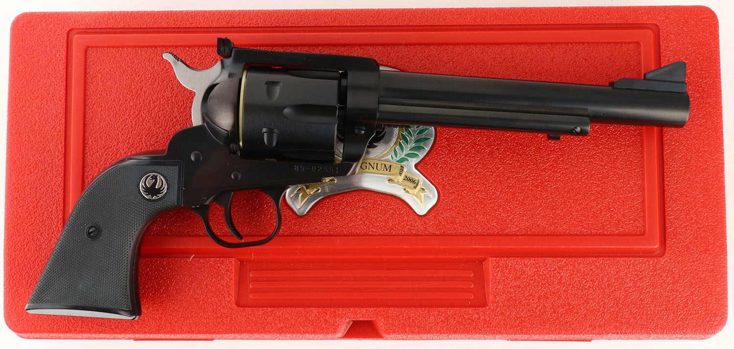 NEW, BOXED Ruger, New Model Blackhawk, 50th Anniversary .44 Magnum Edition, CAL: .44 MAGNUM, MFG: 2006, SN: 89-02551, Single Action Revolver. The factory Ruger logo medallion grips are excellent. The metal blue finish rates 99%+ overall. The top of the barrel is marked in two lines ''50 Years of .44 Magnum 1956-2006''. Bore is minty. The frame holds an adjustable rear sight & the barrel has an elevated serrated blade front sight. Comes in original red hard case, with paperwork, test fire cartridge, lock/key & original packaging. FFL Req. - Value: 500 to 700