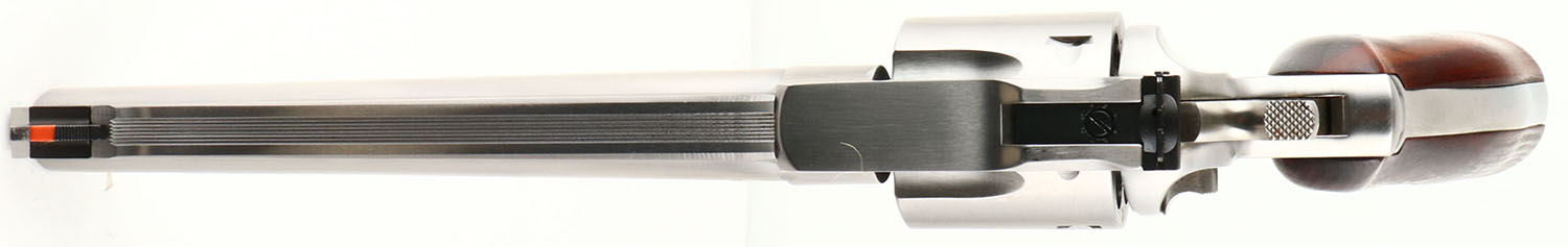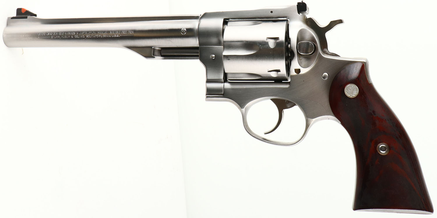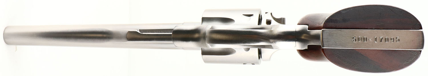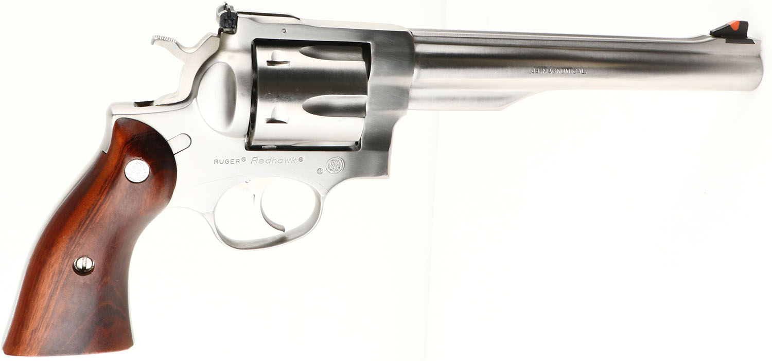 Ruger, Redhawk, CAL: 44MAG, MFG: 1982, SN: 500-17095, Double Action Revolver, 7 1/2'' barrel. The Ruger logo medallion wood grips are excellent, with minor handling marks. The stainless steel finish is excellent, with a couple light scuffs. Bore is excellent. The frame holds an adjustable rear sight & the barrel has a serrated blade front sight, with orange insert. FFL Req. - Value: 600 to 1000
