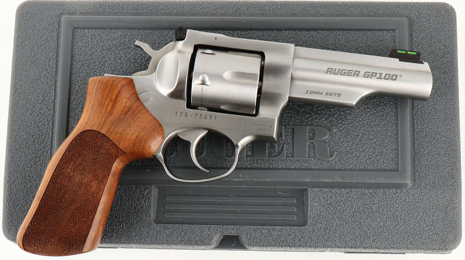 New & Cased Ruger, GP-100 Match Champion, CAL: 10mm, MFG: Modern, SN: 178-75691, Double Action Revolver, 4 1/4'' barrel. The checkered wood grips are excellent. The polished stainless steel finish is excellent. Bore is minty. The frame & barrel hold factory sights, front sight has green fiber rod, rear has shite U. Comes with hard case, owners manual & lock, NOS. FFL Req. - Value: 500 to 750