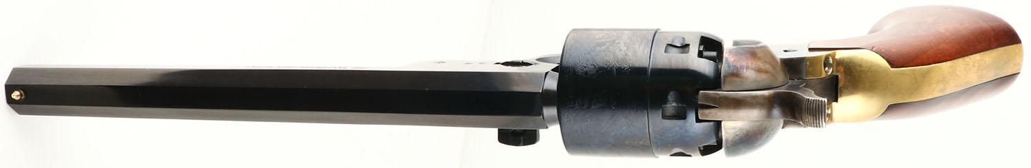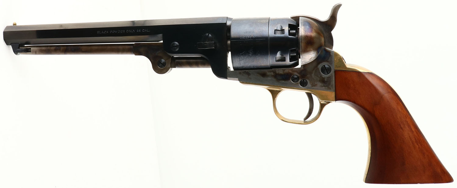 F. LLI Pietta, Model 1851 Navy, CAL: 44, MFG: Modern, SN: 462354, Black Powder Percussion Revolver, 7 1/2'' barrel. The original wood grips are Excellent, with a minor wear from handling. The engraved & blued barrel & cylinder are excellent, The case-hardened frame, trigger & hammer are very good some has started to fade, all having vivid-colors. Bore is excellent. The barrel carries a single post bead. A very nice condition, modern black powder revolve. Black Powder Muzzleloader, No FFL Req - Value: 200 to 400