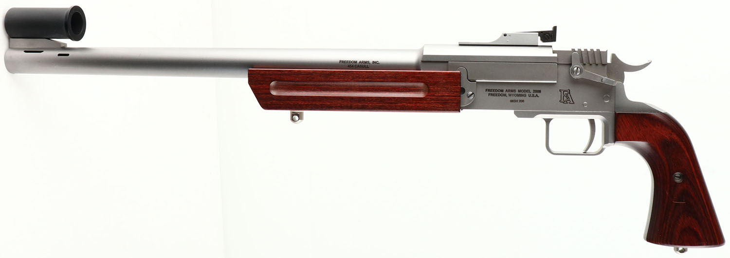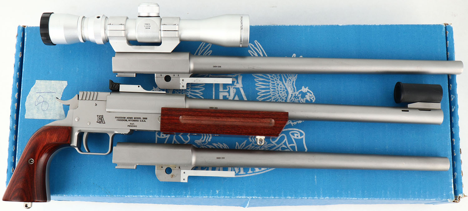 BOXED, Freedom Arms, Model 2008 3- Barrel Set, CAL: 454 CASULL, 223 REM & 260 REM, MFG: Modern, SN: 08SH208, Break Action Single Shot Pistol, 2 @ 15'' & 1 @ 16''. The wood pistol grip & forend are excellent. The stainless steel finish on the frame & barrels rates 98%, with minor handling marks & scuffs to all metal components. Bores are all excellent. The 454 barrel that's currently on the pistol has a set of target sights; an adjustable rear sight & large globe front sight. The 260 REM barrel holds a Optics Pro Hunter 2-6x32 stainless steel scope & the 223 REM barrel has rear sight provisions, with (3) open screw holes. All barrels are serial numbered to the gun. Comes in original box. This gun retails for $1,800 & each additional barrel is $640. FFL Req. - Value: 2000 to 3000