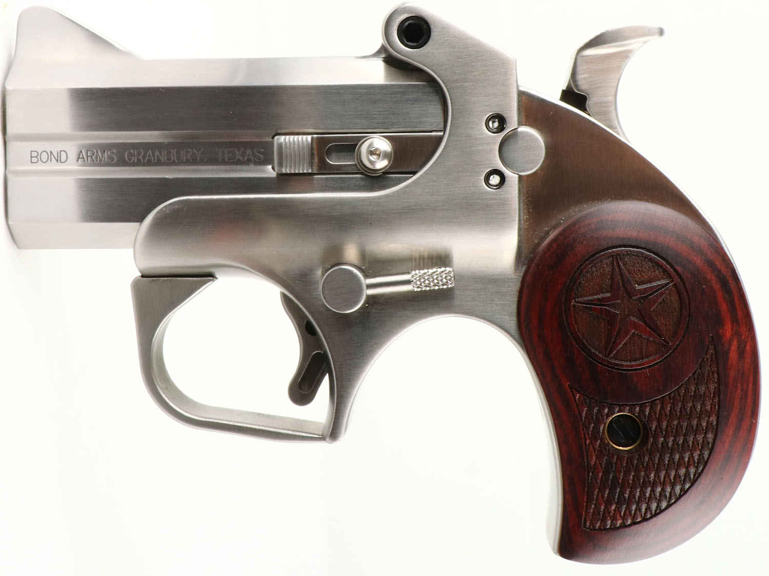 CASED, Bond Arms, Texas Defender, CAL: .410/45 LC, MFG: Modern, SN: 36746, Single Action Revolver, 3'' barrel. The checkered rosewood grips with star emblem are excellent. The stainless steel finish is excellent. Bores are excellent. Fixed notch rear sight & blade front sight. Comes in factory hard case, with paperwork. FFL Req. - Value: 500 to 600