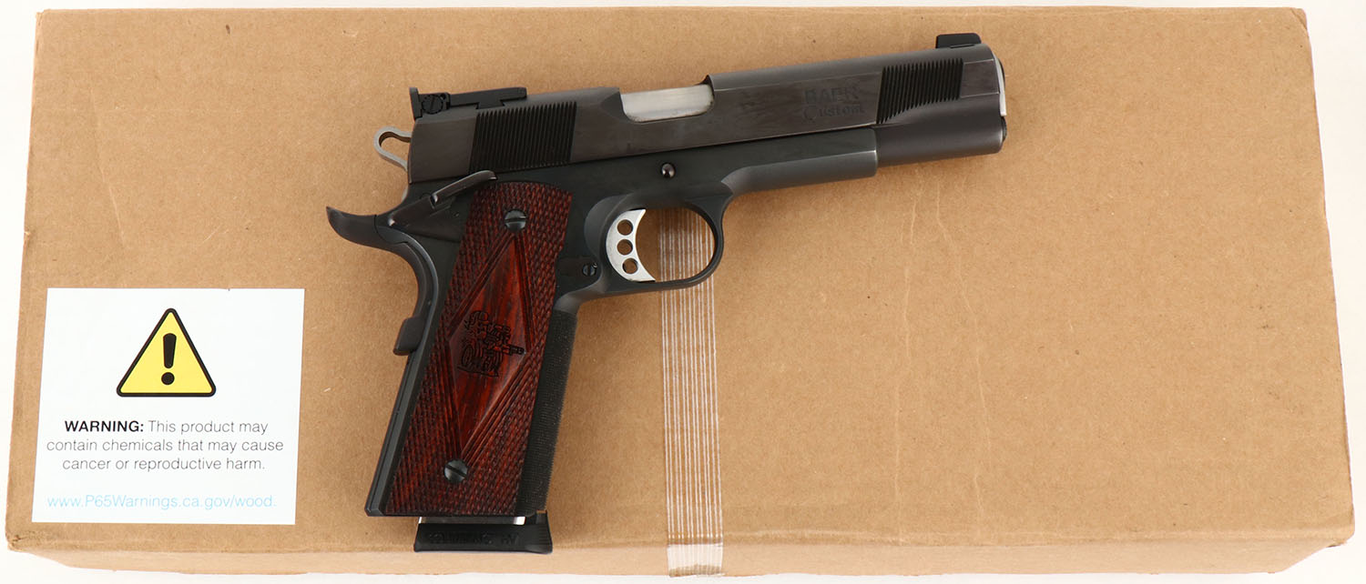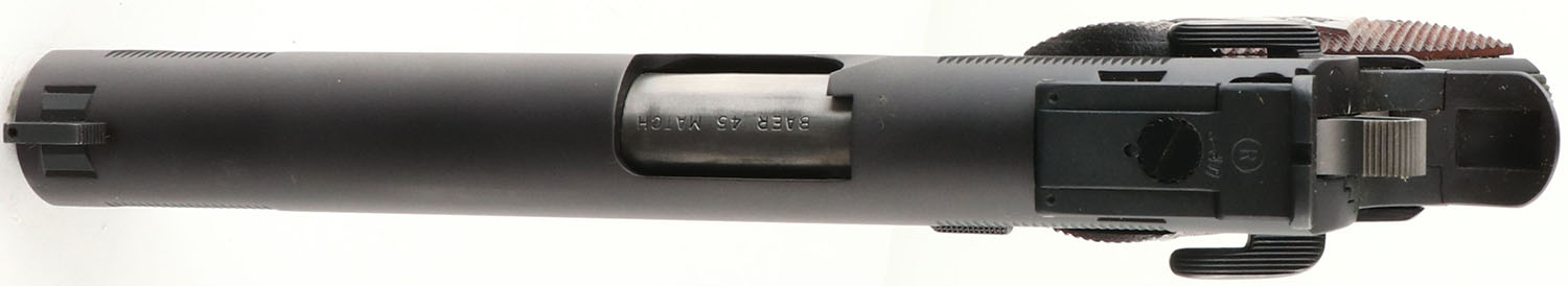 BOXED, Les Baer Custom, 1911 Ultimate Master Combat Pistol, CAL: 45 ACP, MFG: Modern, SN: LB6600, Semi Auto Pistol, 5'' barrel. The checkered wood grips with the LB logo are excellent. The factory metal finishes rate 99%+ overall. Bore is mint. The slide holds an adjustable rear sight & fixed blade front sight. Comes in original box, with magazine, owners manual, paperwork, lock/key. List of Features From Baer Website: Baer NM steel frame and NM slide with blued finish - Baer NM barrel and stainless steel bushing - Low-mount LBC adjustable sights with hidden rear leaf - Baer dovetailed front sight - Double serrated slide - Fitted slide to frame - Lowered and flared ejection port - Two-piece beveled mag well - High checkered front strap @ 30 lpi - Checkering underneath trigger guard @ 30 lpi - Serrated rear of slide @ 40 lpi - Serrated top of slide - Baer deluxe Commander hammer and sear - Baer extended ambi safety - Tuned extractor - Baer extended ejector - Baer checkered slide stop - Baer beavertail grip safety with pad - Baer mag catch - Baer speed trigger with crisp 3 1/2 lb action job - Polished feed ramp and barrel throat - Baer Premium Checkered grips - Tuned for total reliability - Blued finish. This gun retails on Baer Website for $4,083. FFL Req. - Value: 3000 to 4000