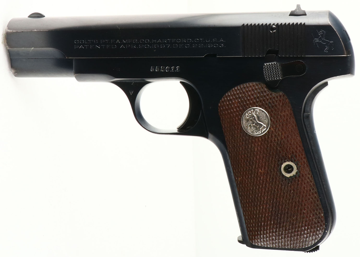 Colt, 1903 Pocket Hammerless (.32 Automatic), CAL: .32 Rimless Smokeless, MFG: 1941, SN: 552611, Semi Auto Pistol, 3 3/4'' barrel. The Rampant Colt silver medallion, checkered walnut grips are excellent. The original metal blue finish rates 99%, with minor storage marks. Bore is excellent, near mint. The slide holds a fixed notch rear sight & half-moon blade front sight. Comes with (2) Colt marked mags that read ''CAL.32 COLT''. A beautiful representation of a 1903 Pocket Hammerless. FFL or C&R Req. - Value: 1200 to 1600