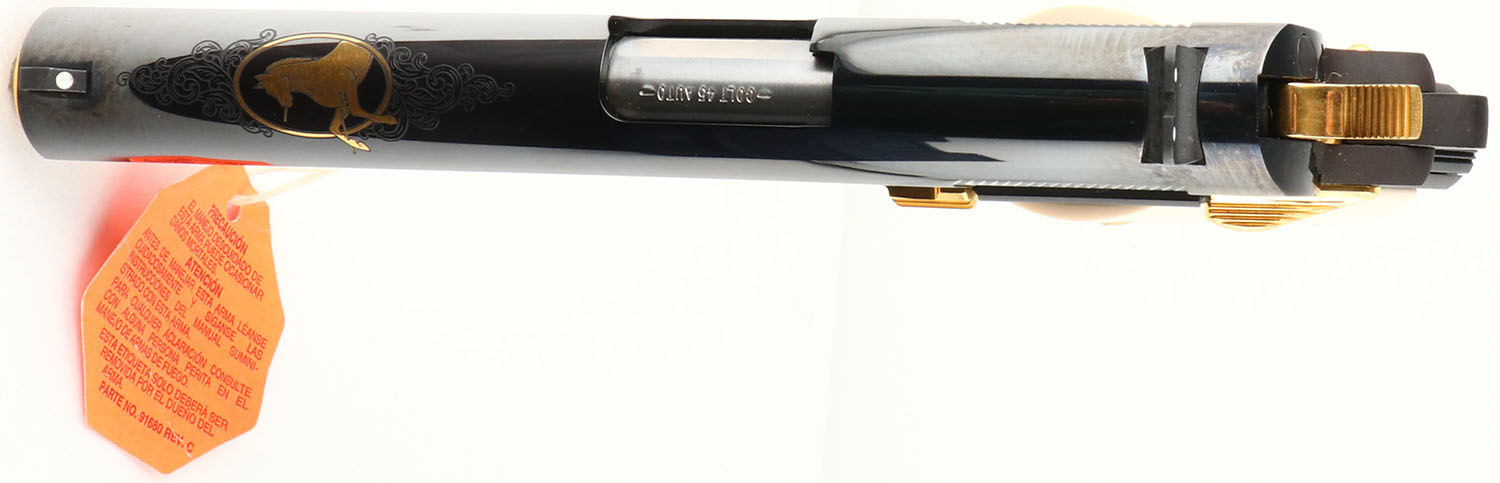 CASED, Colt Government Model Series 80 ''100 Years of Service'' Edition, CAL: 45 AUTO, MFG: 2011, SN: 2844318, Semi Auto Pistol, 4 7/8'' barrel. The silver Colt medallion faux ivory grips are excellent. The metal blue finish on the frame & slide rates 99%+. The gold tone finish on the hammer, safety, slide lock, magazine release, barrel ring & screws is excellent & bright. The left side of the slide displays beautiful ornamental scroll engraving with gold accents, is marked ''100 YEARS OF SERVICE'' in gold tone lettering & has a gold tone Rampant Colt on the back on the slide. The right side of the slide displays the same engravings & accents, with Sam Colt signature & a gold image of the iconic Blue Onion Dome on the back of the slide. The top of the slide displays a gold tone vignette of the Rampant Colt amongst ornamental engraving. Bore is mint. The slide holds white dot sights. Comes in factory hard case, with related paperwork, hang tag, extra mag & lock/key. - Value: 1500 to 2500