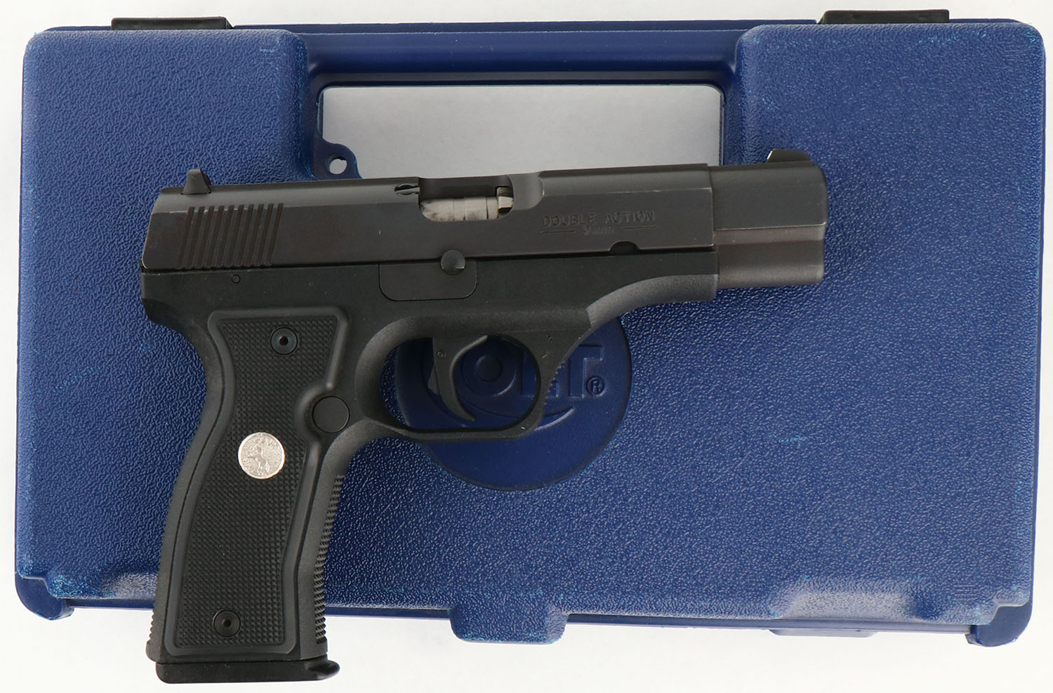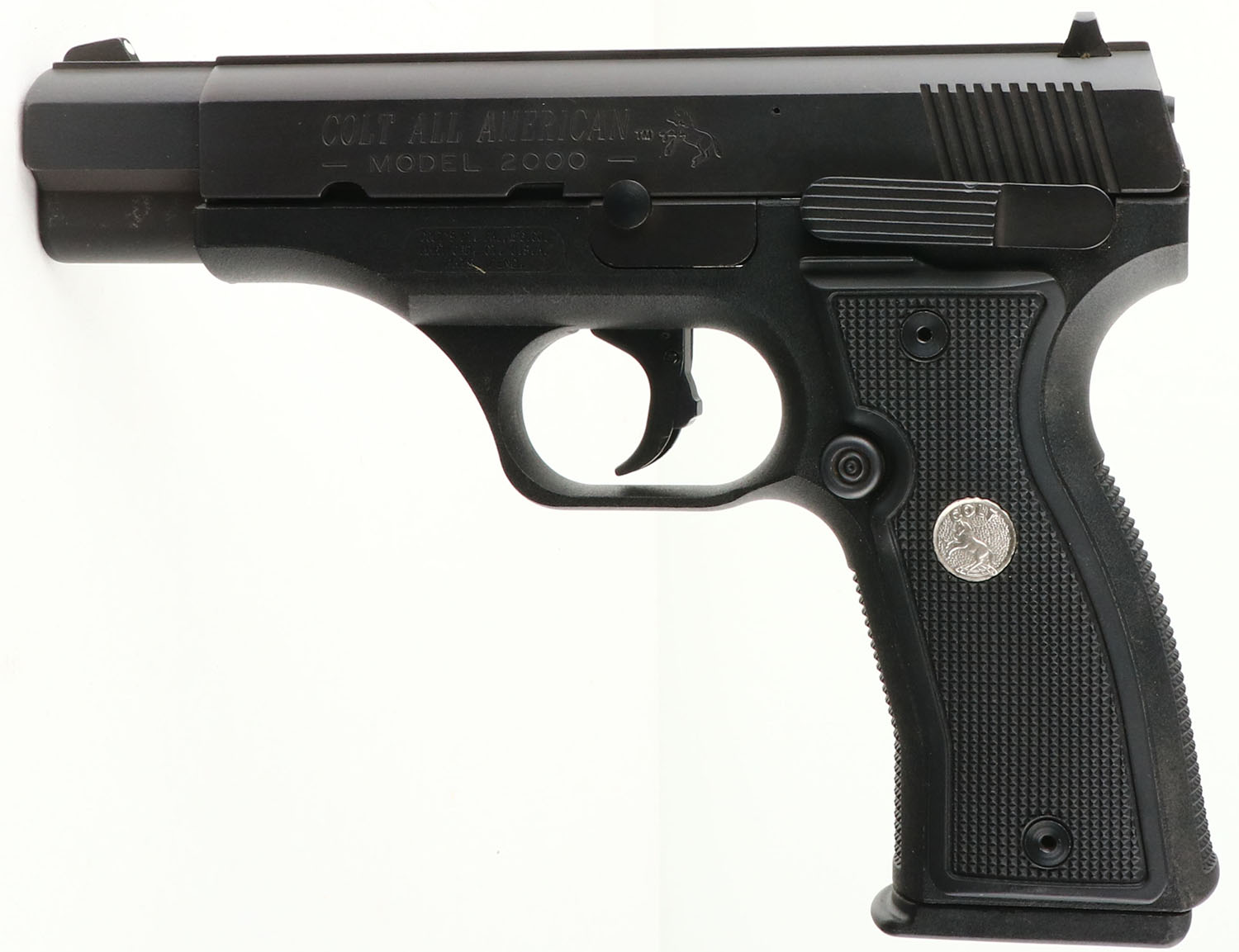 CASED, Colt, All American Model 2000, CAL: 9mm, MFG: 1993, SN: PF15230, Semi Auto Pistol, 4 1/2'' barrel. The Colt logo medallion checkered plastic grips are excellent. The factory matte black finish rates 99%, with minor storage marks. Bore is excellent. Factory white dot sights. Comes in factory hard case, with related paperwork, speed loader, alan wrench, cleaning brush/rag. FFL Req. - Value: 400 to 600