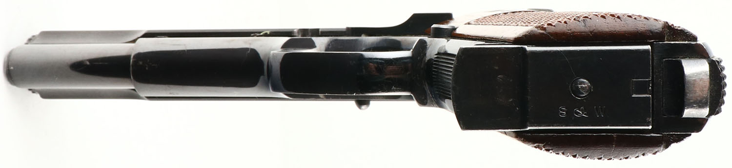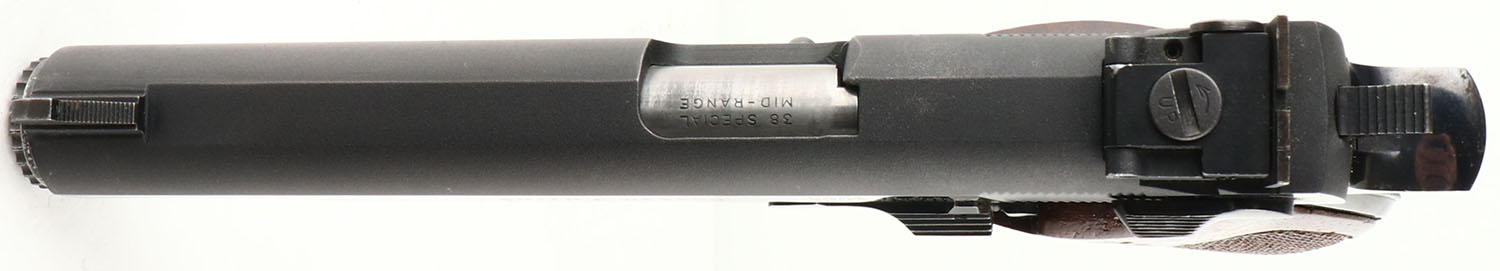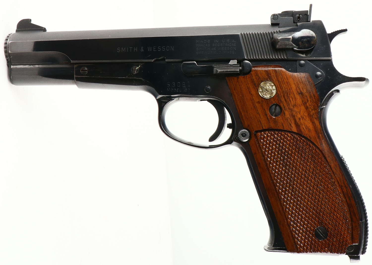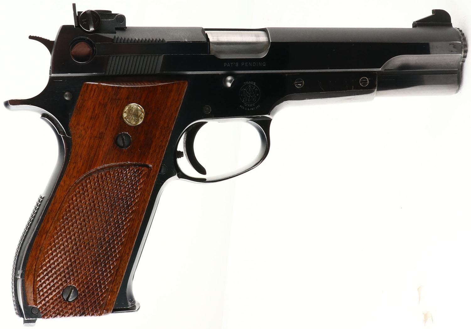 Smith & Wesson, Model 52, CAL: .38 SPL Mid Range, MFG: 1961-63, SN: 53091, Semi Auto Pistol. 5'' barrel. The S&W logo medallion checkered wood grips are excellent. The original metal blue finish rates 97%. Bore is excellent. Factory sights. A nice example of a no-dash Model 52. FFL or C&R Req. - Value: 700 to 1000