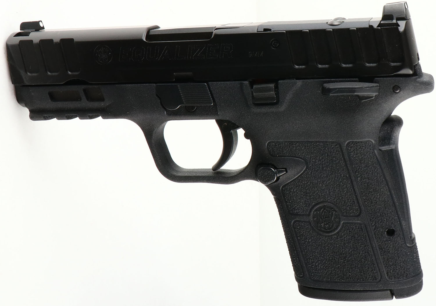 BOXED, Smith & Wesson Model Equalizer, CAL: 9mm Luger, MFG: Modern, SN: PJD0447, Semi Auto Pistol, 3 1/2'' barrel. The S&W logo synthetic checkered grips are excellent. The factory matte black finish rates 99%. Bore is excellent. Factory sights. Comes in original labeled box with speed loader, lock & paperwork. NOS. FFL Req. - Value: 400 to 500