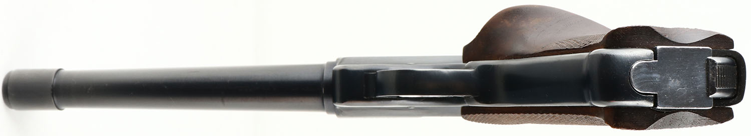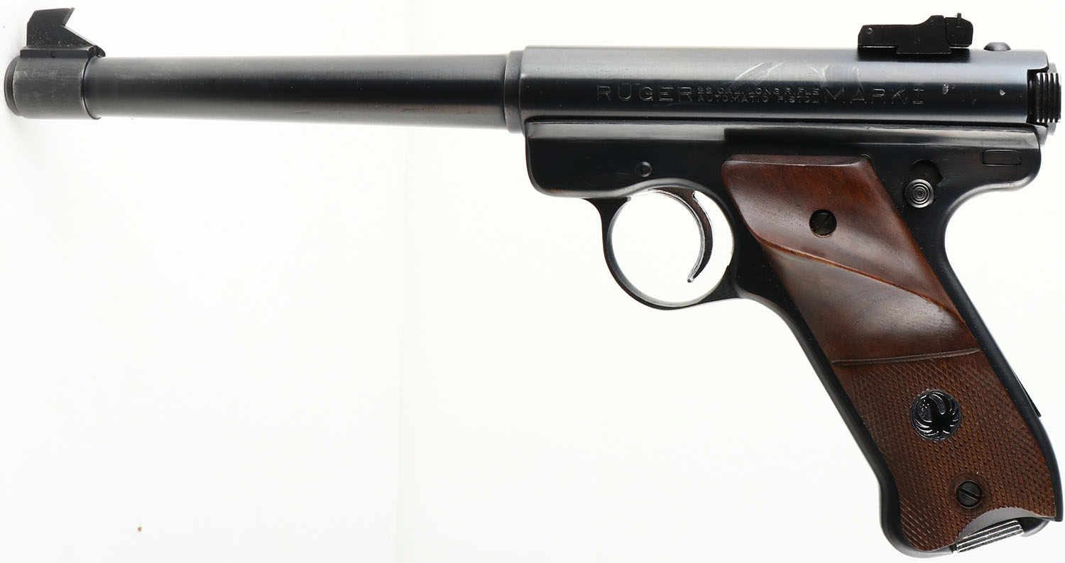 BOXED Ruger, Model Mark I Target, CAL: 22 LR, MFG: 1966, SN: 334823, Semi Auto Pistol, 6 7/8'' barrel. The checkered thumb rest factory walnut grips, with black Ruger Phoenix on a silver background are excellent. The factory metal blue finish rates 99%+ overall. Bore is excellent & bright. The frame holds an adjustable rear sight & Partridge front sight. Comes in the original red & yellow box, with factory booklet & warranty card. FFL or C&R Req. - Value: 500 to 1000