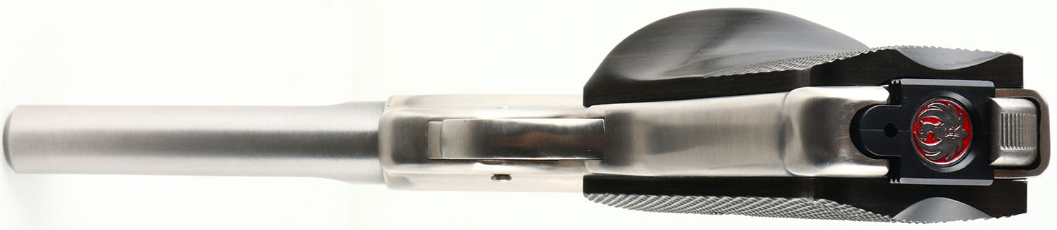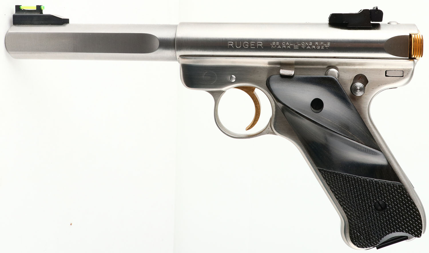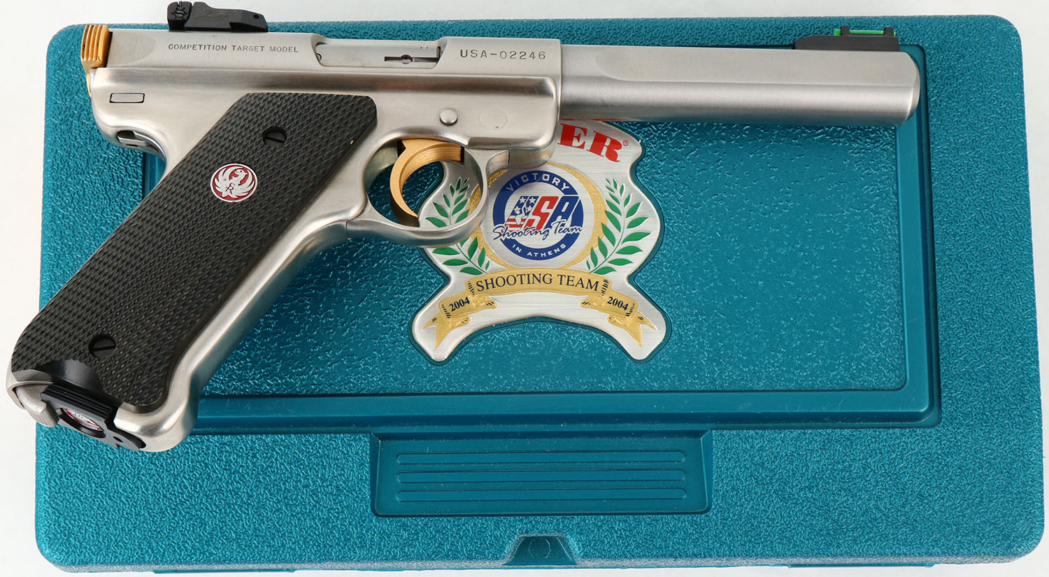 CASED & RARE Ruger, Mark II Target Competition ''U.S. OLYMPIC SHOOTING TEAM'' edition, CAL: 22 LR, MFG: 2004, SN: USA-02246, Semi Auto Pistol, 5 1/2'' Heavy slab sided barrel. 6 R.H. groove/ twist. 1/16'' turns. The checkered thumb rest factory laminated grips, with silver Ruger Phoenix on a red background are mint. The factory stainless steel finish rates 99%+ overall. The gold colored plate on the trigger & rear of bolt rate excellent. Bore is excellent. The pistol features a fiber optic Partridge front sight & adjustable rear sight. It is factory drilled & tapped for mounting optics & the rear of the bolt marked ''USA Shooting Team'' surrounded by ''Victory in Athens''. Comes in the original factory hard case correctly end labeled & numbered to the gun, a pair of magazines, spare Hi-Viz fiber optic inserts, owners manual, paperwork, internal bag & test cartridge. NOS gun store inventory. FFL Req. - Value: 400 to 800