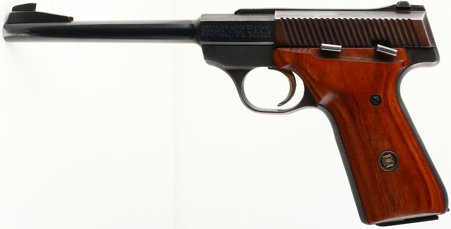 Browning, Challenger II, CAL: 22LR, MFG: 1980, SN: 655PM03292, Semi Auto Pistol, 6 3/4'' barrel. The Browning brass medallion wood grips are excellent, with handling marks & multiple light scuffs. The metal blue finish rates 95%. The slide is toned plum. Gold tone trigger. Bore is excellent. The slide carries an elevated rear sight & the barrel has a serrated ramp elevated blade front sight. Comes with a Bianchi 22 Auto leather holster. FFL or C&R Req. - Value: 300 to 600
