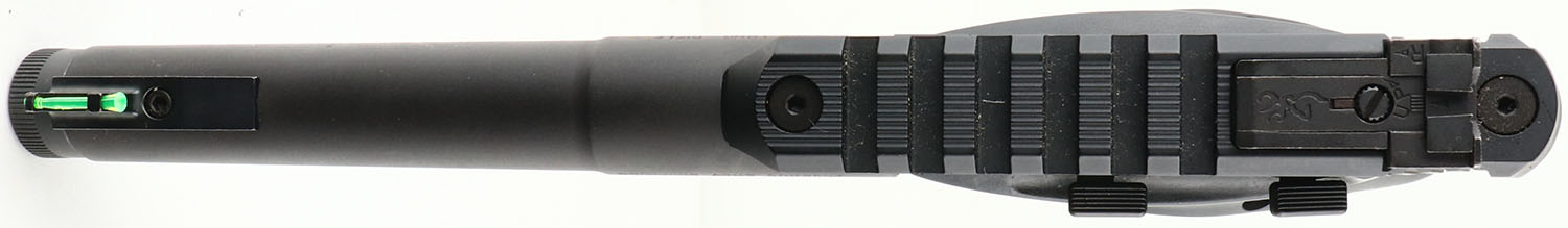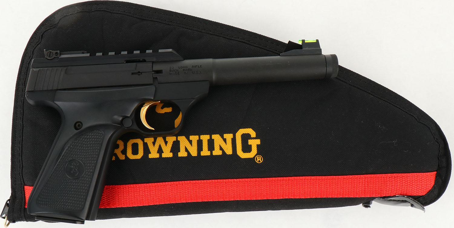 Browning, Model ''Buck Mark'', CAL: 22LR, MFG: 2001, SN: 515XR13009, Semi-Auto Pistol, 5 7/8'' barrel. The Browning logo target grips are excellent, The parkerized finish rates 97%. Bore is excellent. The frame holds an adjustable rear sight & elevated green fiber optic rail front sight. Gold trigger. Factory Browning marked mag. Marked factory soft case has lock & paperwork, good shooter target pistol. FFL Req. - Value: 300 to 500