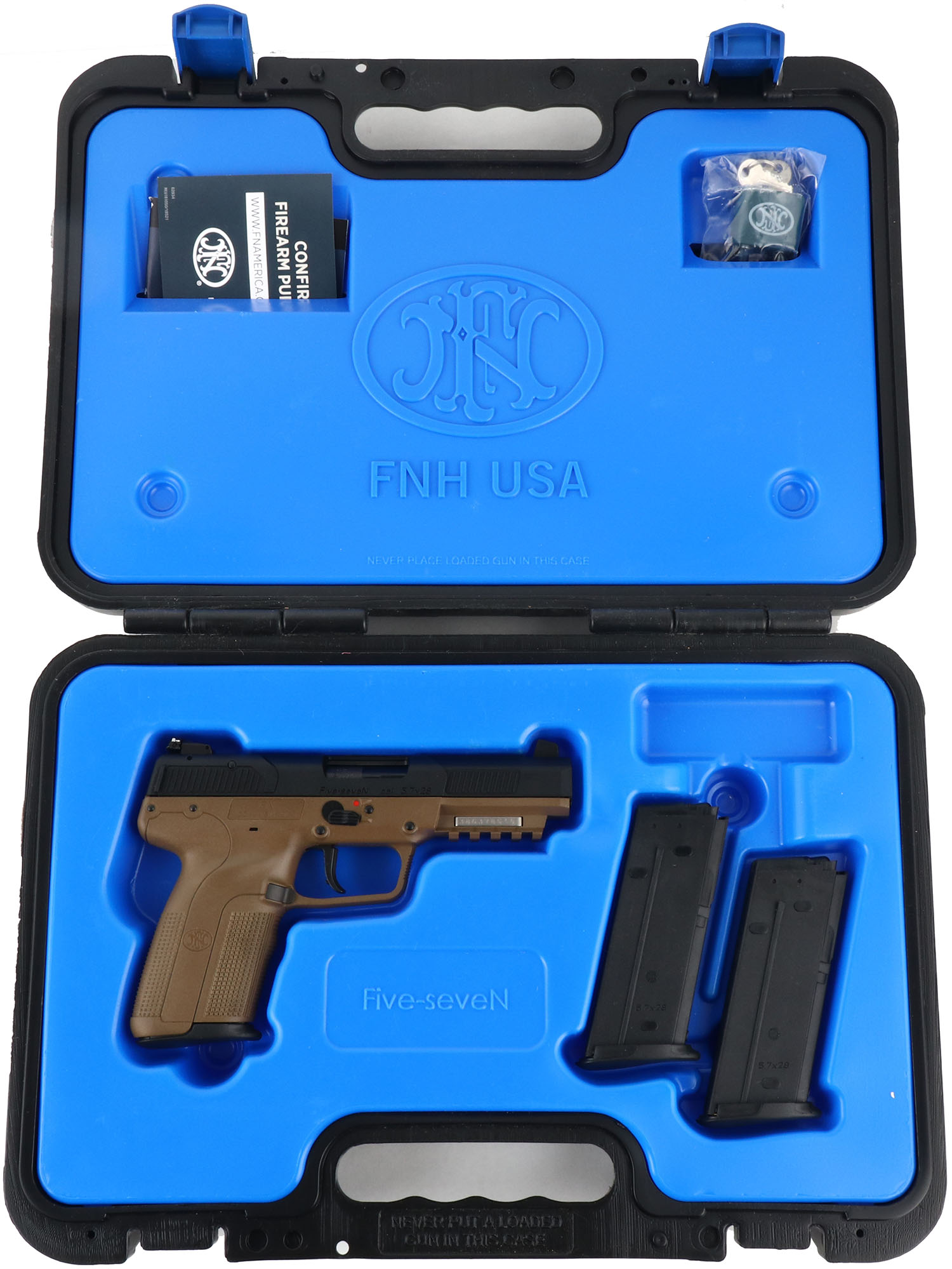 BOXED, FN, Model FIVE-SEVEN, CAL: 5.7x28, MFG: 1998-present, SN: 38638510, Semi Auto Pistol, 4 3/4'' barrel. The factory FN checkered plastic grips are excellent. The black polymer slide is excellent. Bore is excellent, has two white dot front sights & single white dot front sight. Has picatinny rail under barrel, Comes in original box with (2) extra (20rd) mags, lock & all paperwork, NIB. FFL Req. - Value: 700 to 1200