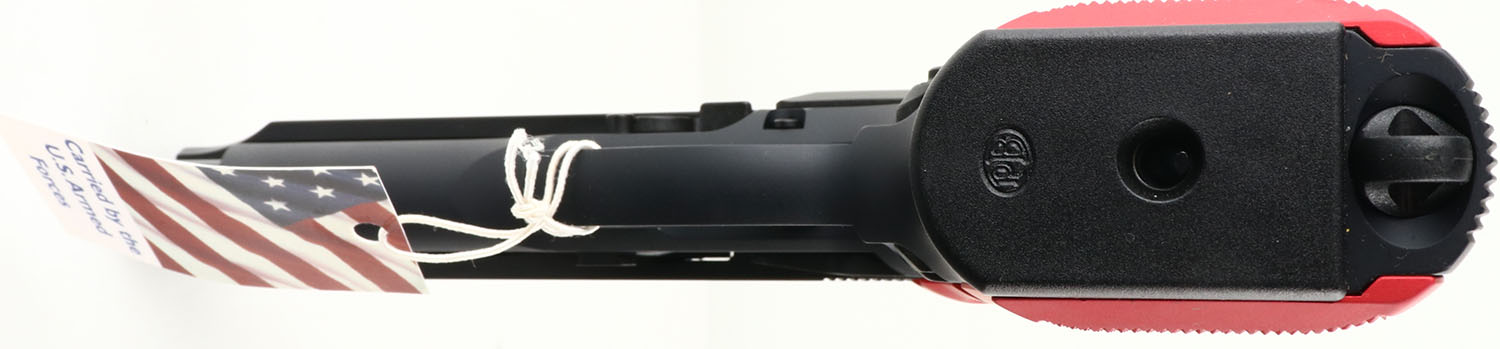 NEW CASED, Beretta, Model M9 U.S. MARINE CORPS, CAL: 9mm, MFG: Modern, SN: M9-123046, Semi Auto Pistol, 4 3/4'' barrel. The factory red aluminum grips are mint. The factory matte black finish is mint with US Flag & Marine logo on left side of receiver, white dot rear sight & single white dot front sight. Comes in factory hard case, with owners manual, brochure, extra black grips, & (3) 15rd mags. FFL Req. - Value: 700 to 1000