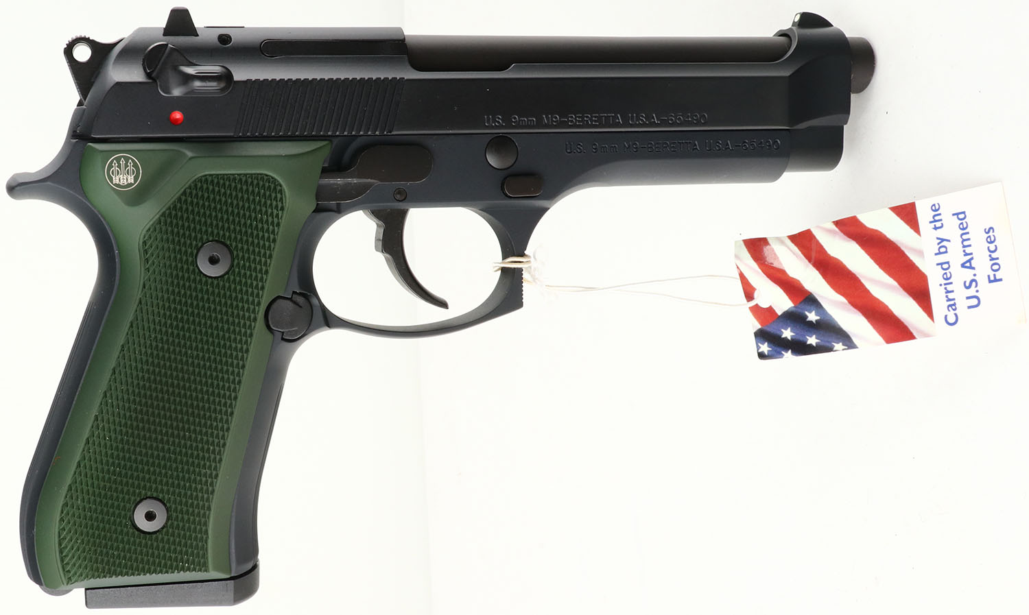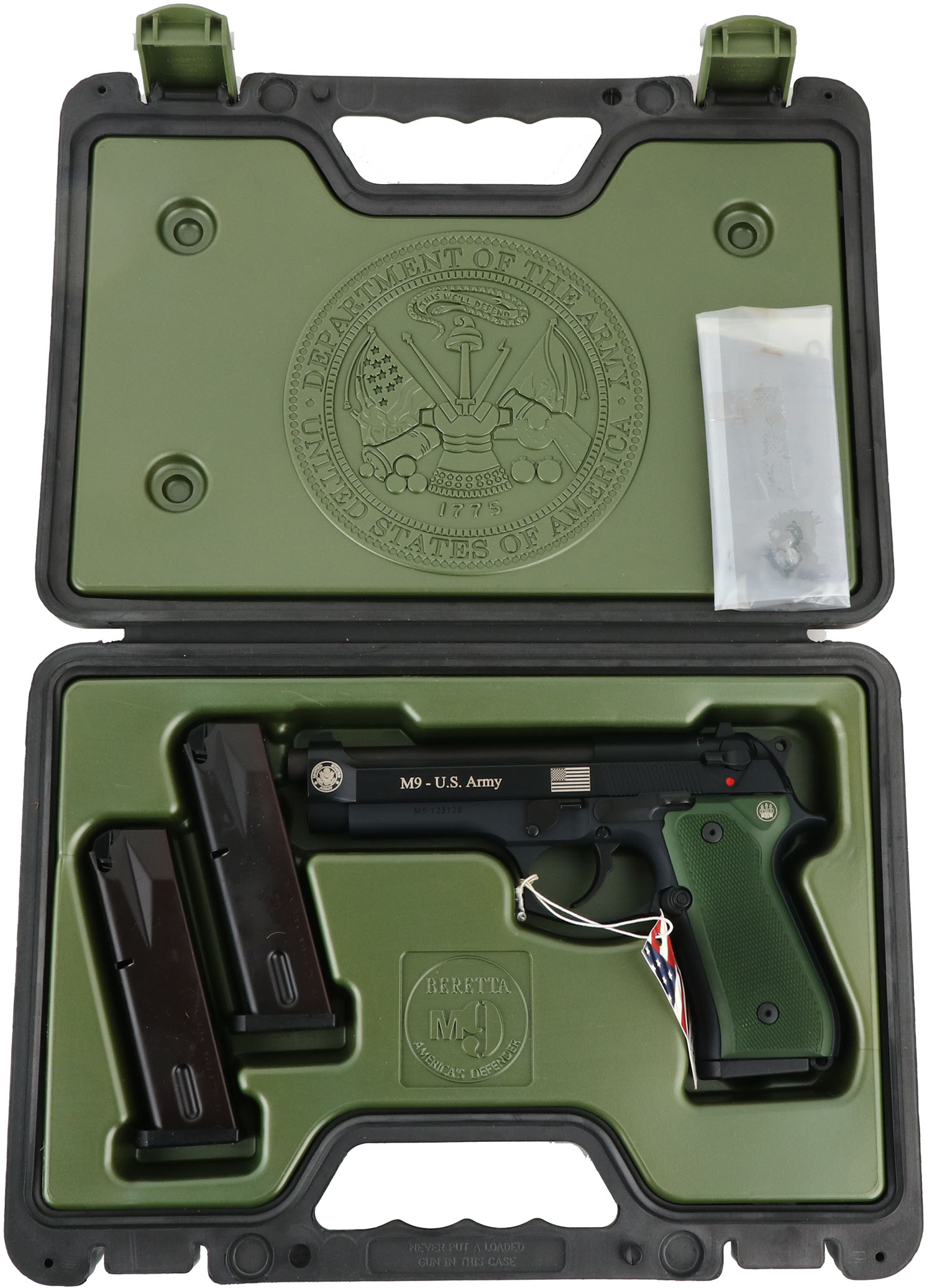 NEW CASED, Beretta, Model M9 U.S. ARMY, CAL: 9mm, MFG: Modern, SN: M9-123128, Semi Auto Pistol, 4 3/4'' barrel. The factory white aluminum grips are mint. The factory matte black finish is mint with US Flag & Army logo on left side of receiver, white dot rear sight & single white dot front sight. Comes in factory hard case, with owners manual, brochure, extra black grips, & (3) 15rd mags. FFL Req. - Value: 700 to 1000