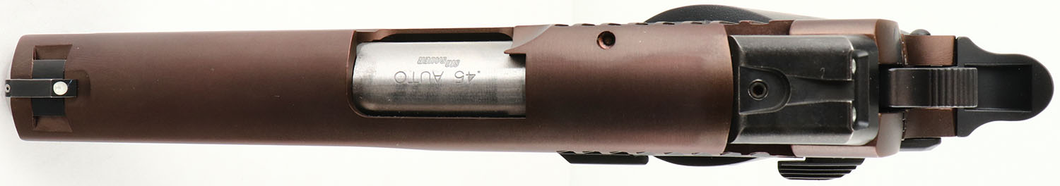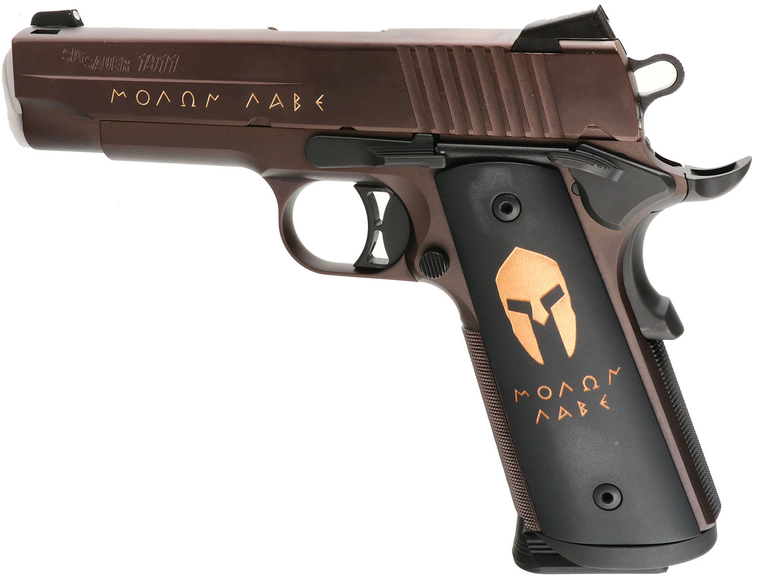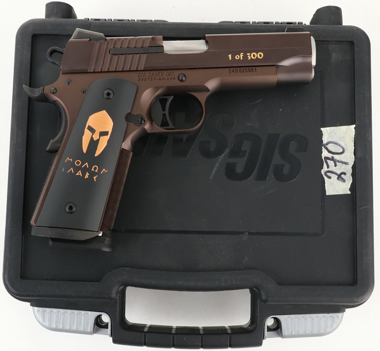 CASED, Sig Sauer, Model 1911CA Spartan 45 Carry, CAL: 45 AUTO, MFG: Modern, SN: 54B025061, Semi Auto Pistol, 4'' barrel. New Old stock, This gun celebrates the war between Greek & Persian Empire in 480 B.C., the modo ''MOLON LABE'' means come & take it, used today by the US special forces appears three times on the pistol, 1 of 300 made, unique oil rubbed bronze Nitron finish on both the slide and frame, with the slide featuring 24kt gold inlay engraving. The low profile sights from Kensight - a division of KFS Industries, Inc. - have self-luminous, green night-sight inserts (.76-inch Trijicon), one on each side of the open square-notch rear sight with a recessed surface and one in the blade-type front sight, checkering on the front strap, Kidney-cut trigger guard, skeletonized trigger & serrated face of hammer, (2) 8rd single stack mags, Comes in factory hard case, with paperwork, lock. FFL Req. - Value: 800 to 1400