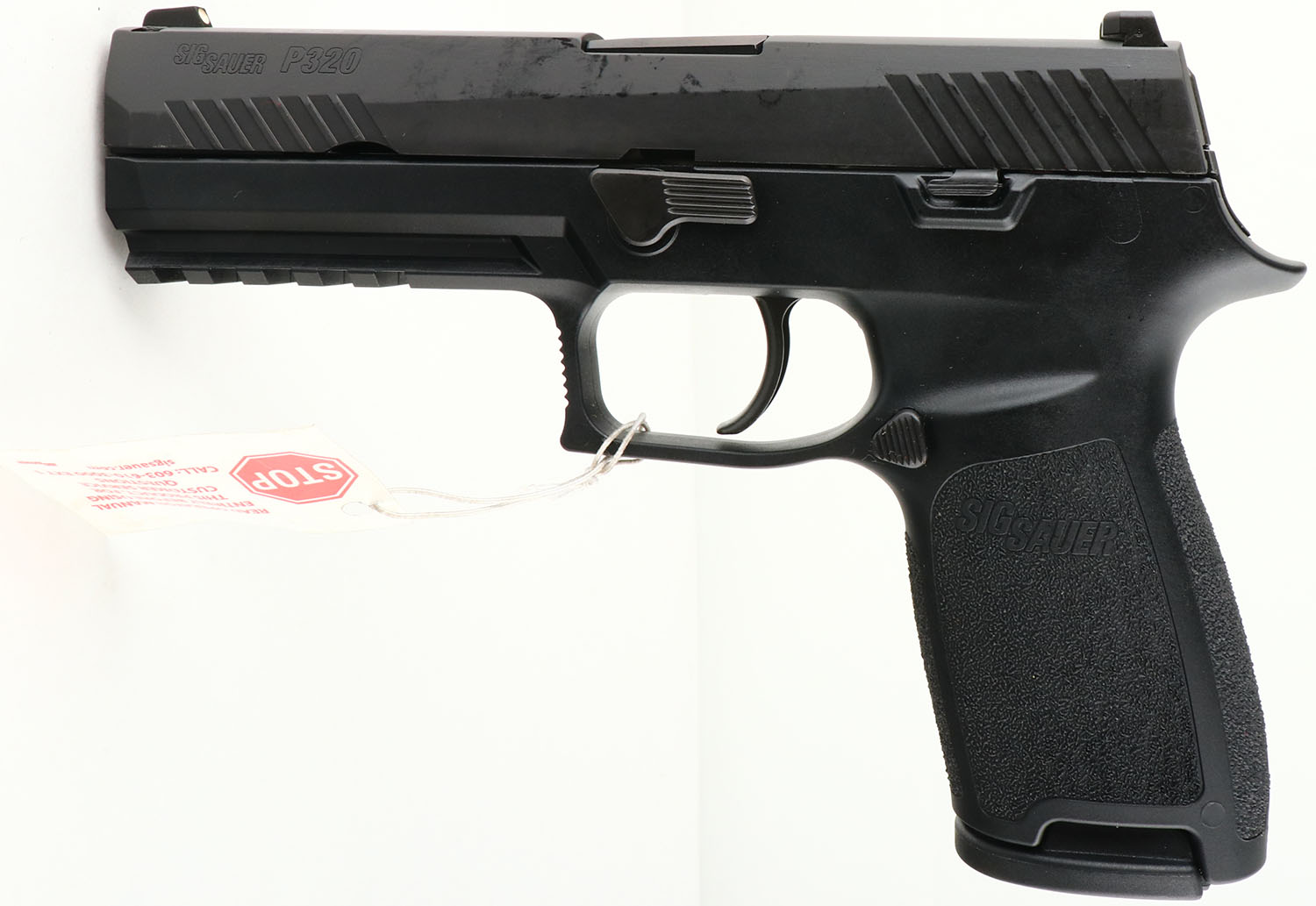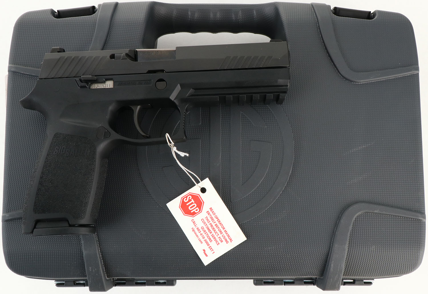 CASED, Sig Sauer, Model P320 Nitron Full-Size, CAL: 9mm, MFG: Modern, SN:58J414311, Semi Auto Pistol, 4 5/8'' barrel. The textured polymer grip frame is excellent. The matte black finish on the slide rates 99%+. Bore is excellent & minty. Factory white dot sights. Comes in factory hard case, with related paperwork, extra magazine & lock/key. FFL Req. - Value: 500 to 600