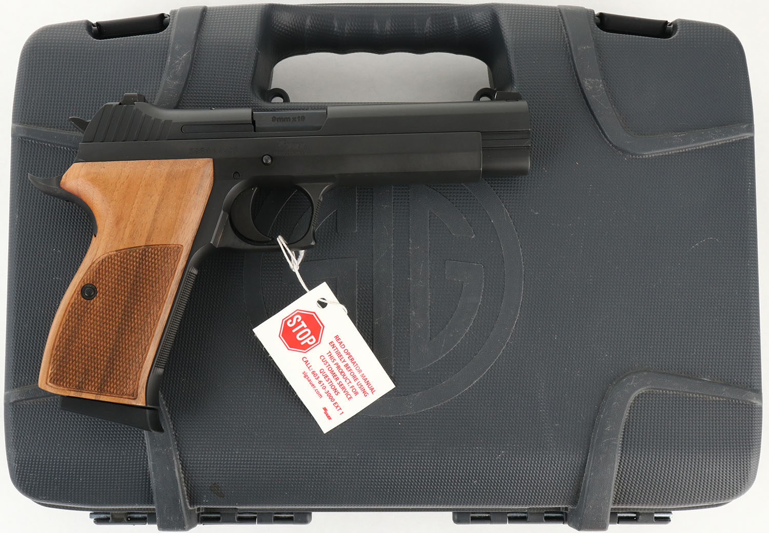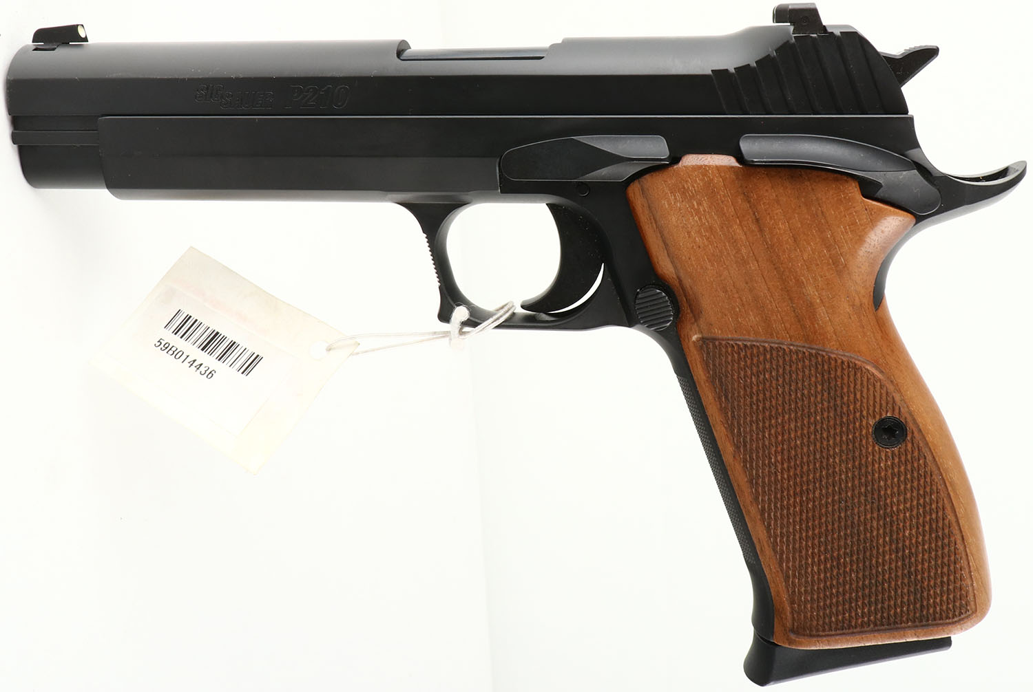 CASED, Sig Sauer, Model P210 Standard, CAL: 9mm, MFG: Modern, SN: 59B014436, Semi Auto Pistol, 4 3/4'' barrel. The checkered wood grips are excellent. The matte black finish on the frame & slide rates 99%+. Bore is excellent & minty. Factory white dot sights. Comes in factory hard case, with hang tag attached, related paperwork, extra magazine & lock/key. FFL Req. - Value: 1200 to 1600