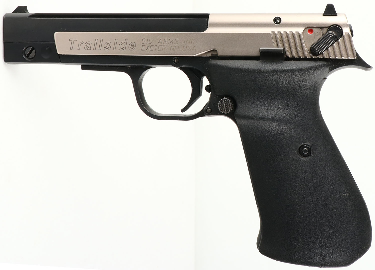 CASED, Sig Arms, Model Trailside, CAL: 22LR, MFG: Modern, SN: E0041253, Semi Auto Pistol, 4 1/2'' barrel. The synthetic grips are excellent, with light handling marks. The original matte black finish on the barrel rates 99% & the stainless steel finish on the slide is excellent. Bore is excellent. Factory sights. Comes with hard case, (2) 10rd mags. & paperwork. FFL Req. - Value: 300 to 600